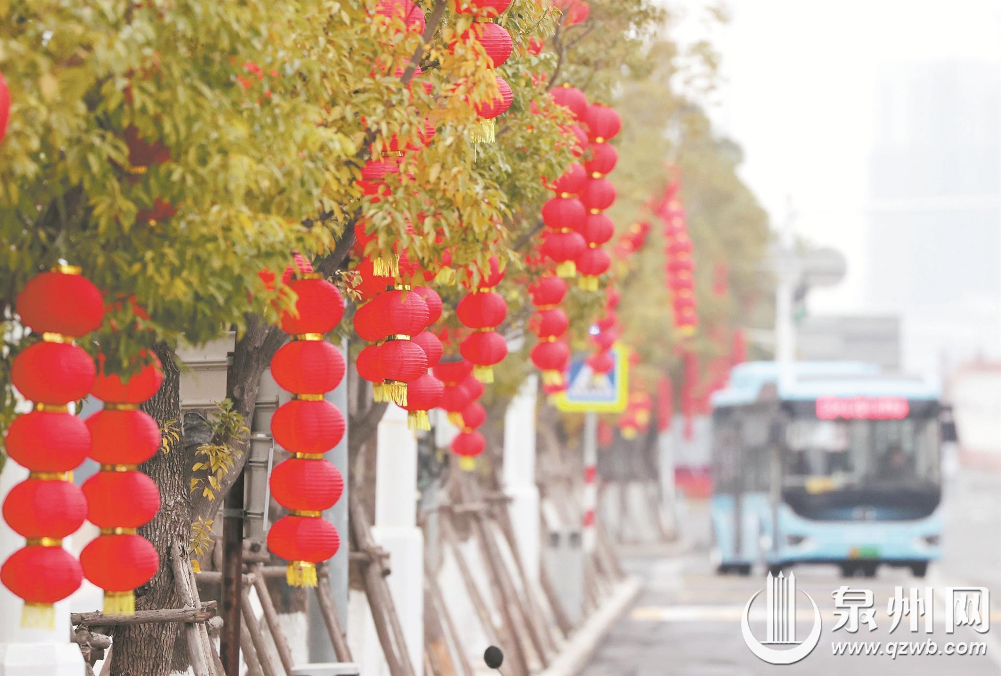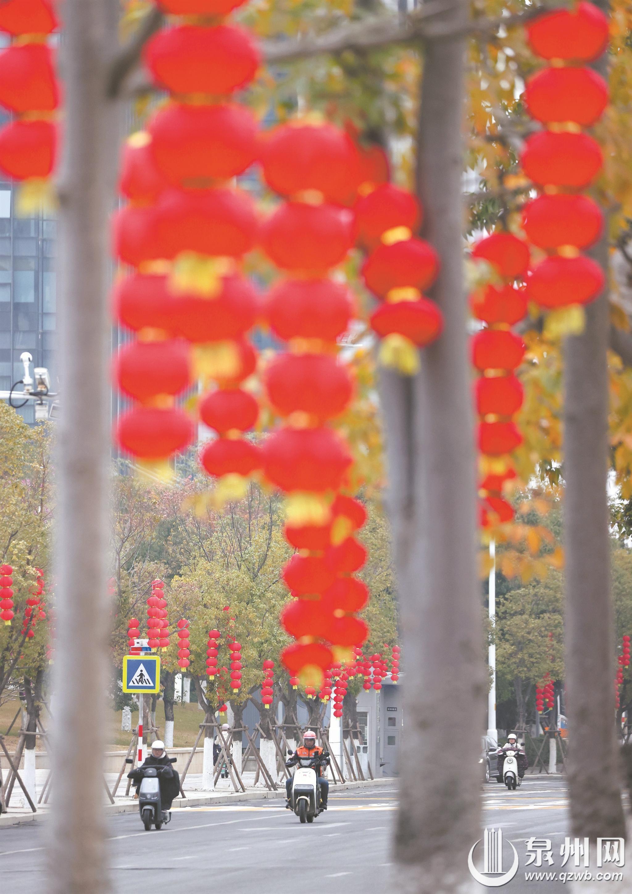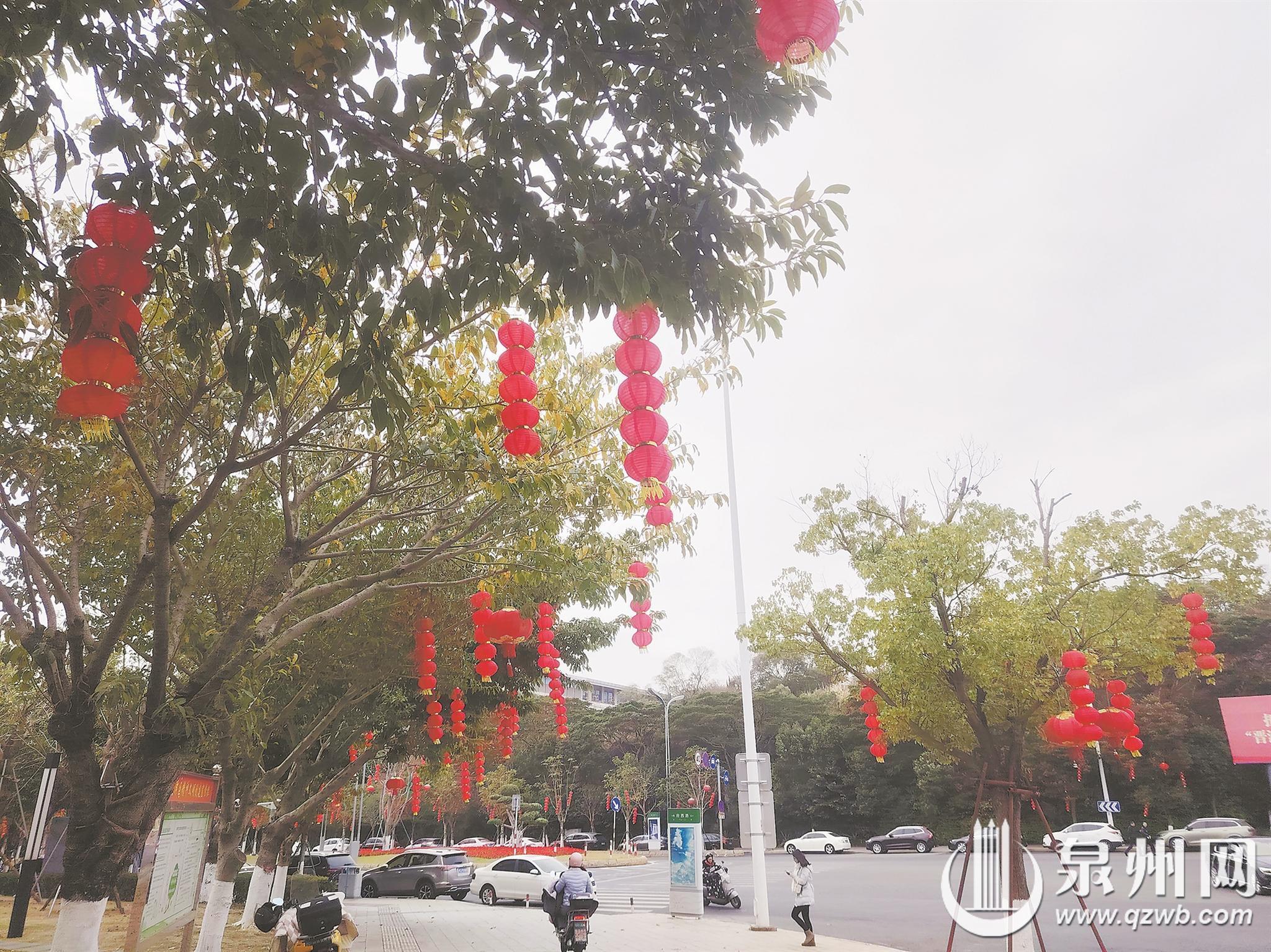 泉州网1月26日讯(融媒体记者王金植 张九强 通讯员张炜杰 陈庚嘉 文/图)随着春节脚步临近,泉州市区大街小巷年味渐浓。记者昨日走访看到,中心市区一些道路已挂上了大红灯笼,行道树缀满金灿灿的藤球灯。红灯笼摇曳生姿,金藤球熠熠生辉,喜庆感扑面而来。