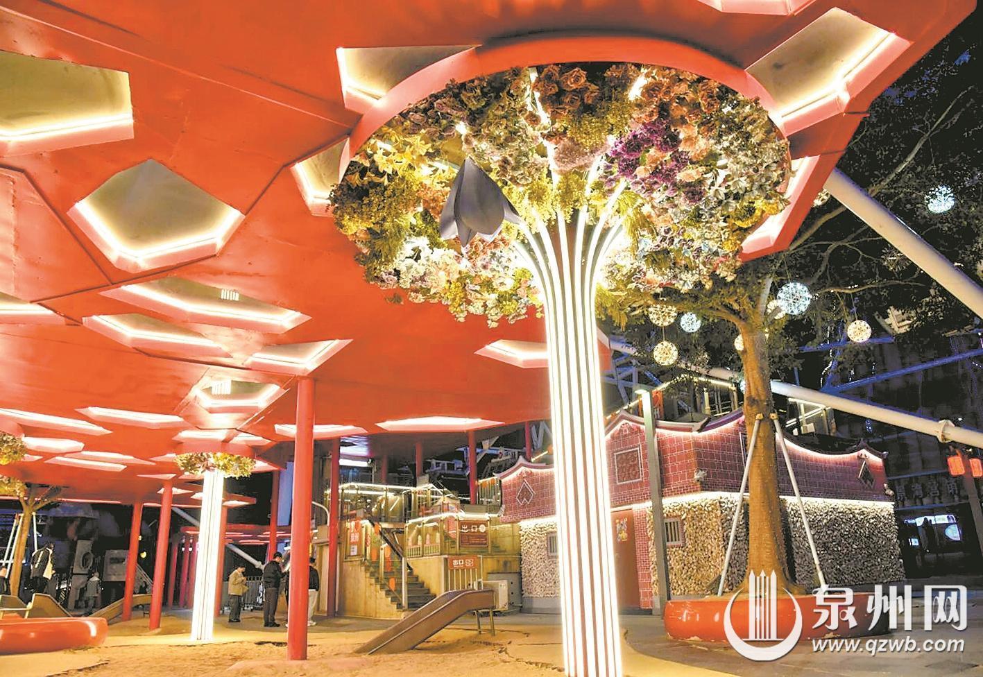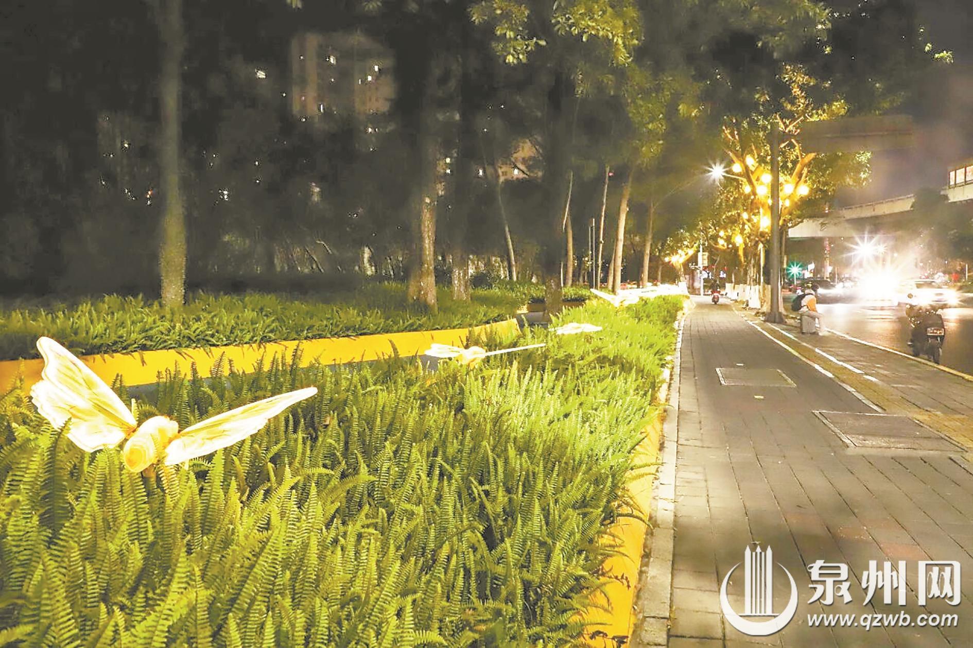 在蟳埔民俗文化村周边道路,行道树早已披上了熠熠银装。“彩蝶”翩跹着跃上枝头,仿佛在繁花间追逐嬉戏,向着夜游蟳埔的游客欢快地宣告“新春,正踏歌而来”。行道树上的枝头缀满金灿灿的“星星”,繁星点点摇曳生姿。街巷间红灯笼高挂、彩灯球点缀,光影交织错落,整条街道都被晕染出浓浓的喜庆底色。