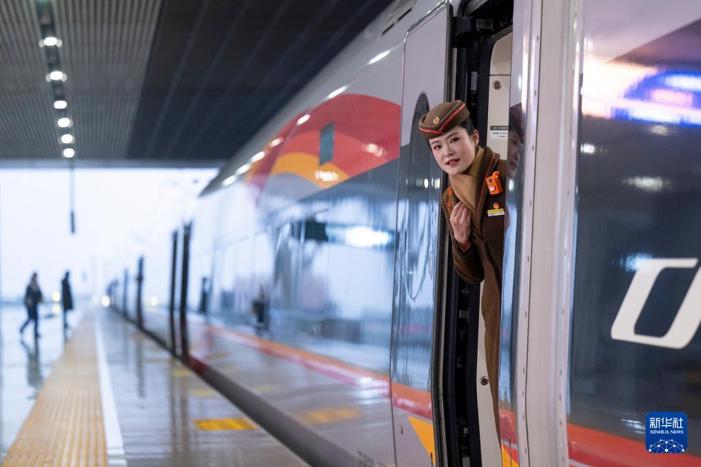 1月26日,在G340次列车上,列车长进行联控关门作业。当日,武汉至北京西G68次车次改为G340次。新华社记者 伍志尊 摄