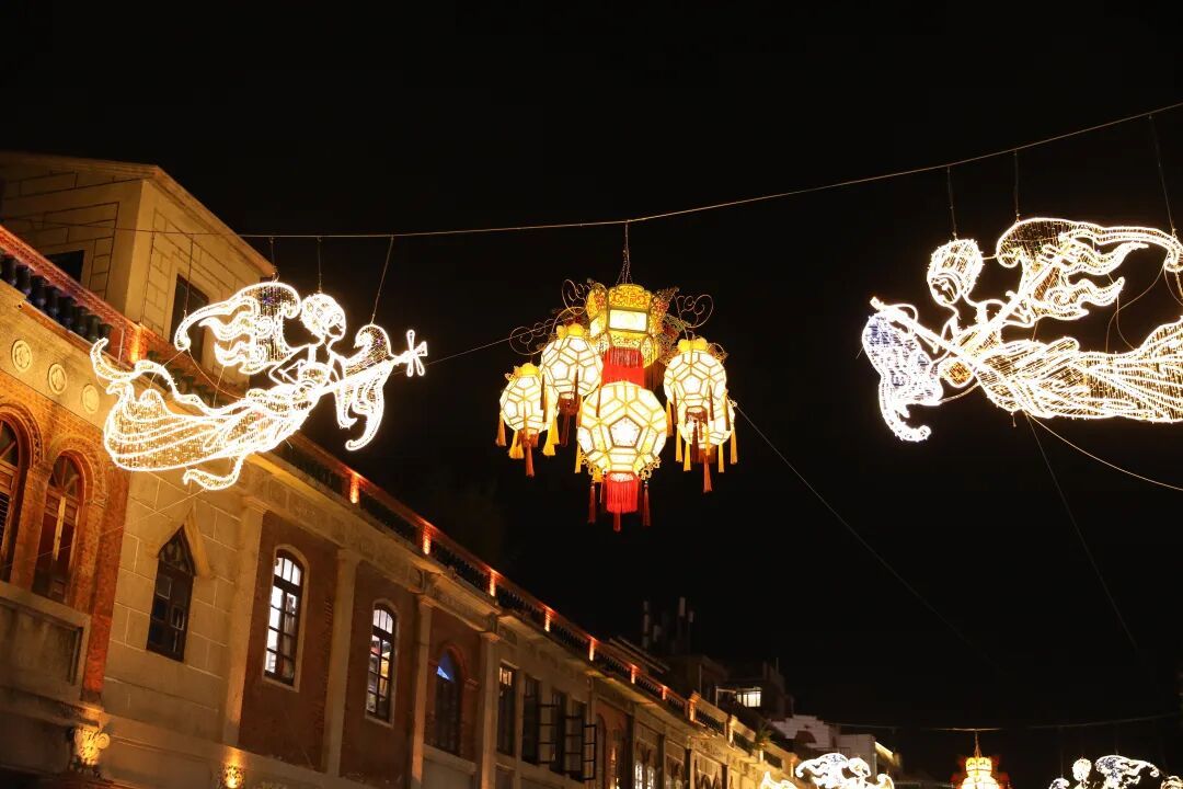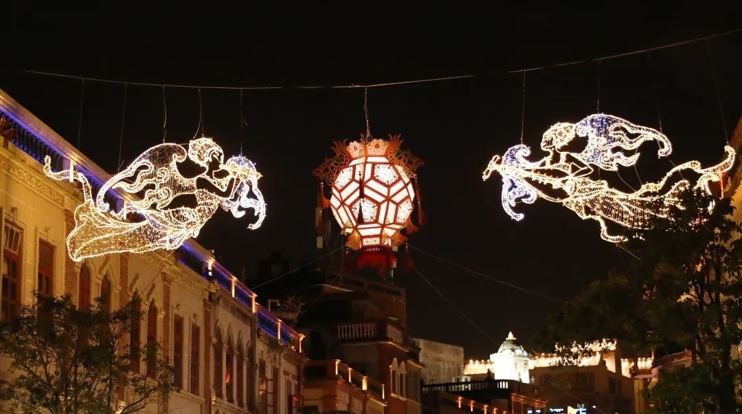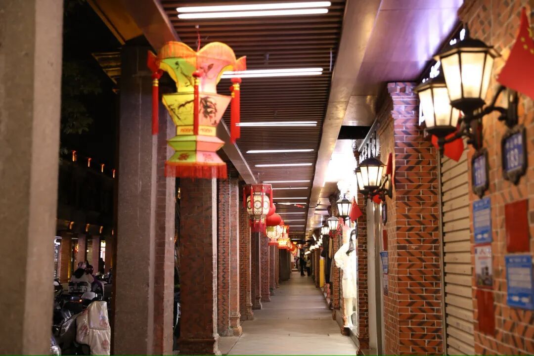 漫步在中山路上,两侧骑楼下的花灯随风摇曳,灯火璀璨,将骑楼装点成一条流光溢彩的星河,为百年老街增添了一份喜庆。
