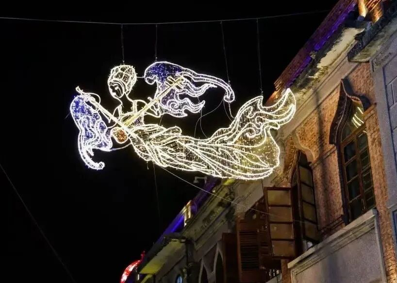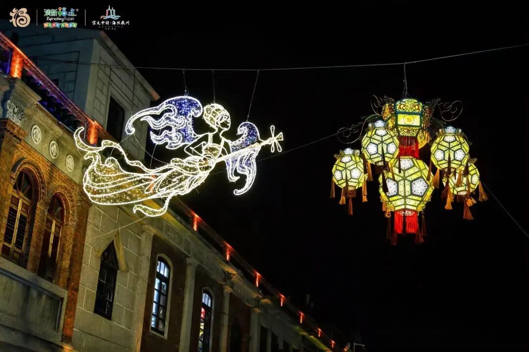 当灯光亮起,刻纸的繁复纹样与乐伎的优雅姿态被勾勒得淋漓尽致,传统非遗工艺与现代照明设计在此完美融合,成为无数游客驻足仰望、拍照留念的焦点。