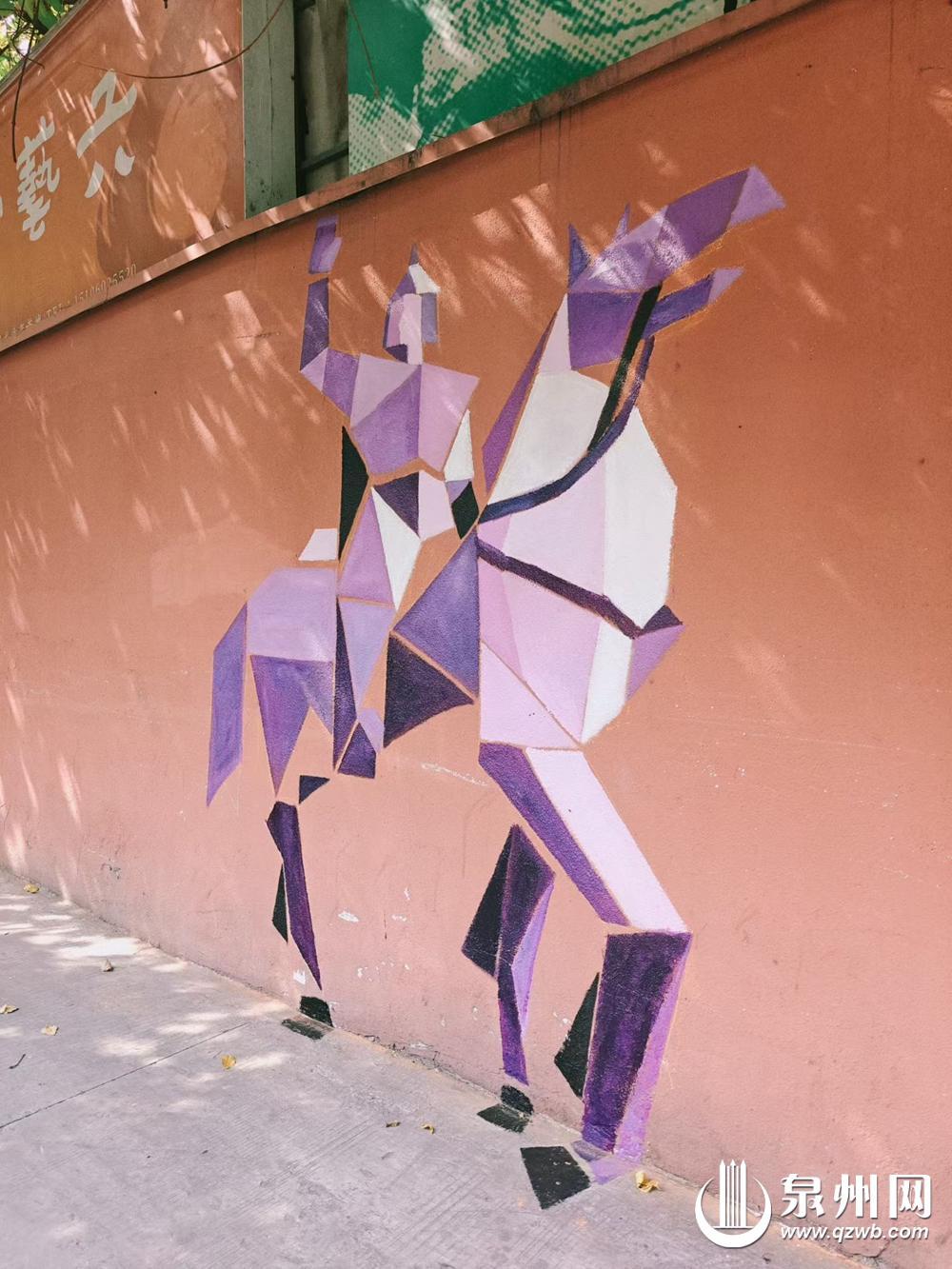 在泉州市区的六艺海朝美术馆,有一幅手绘墙画格外引人注目。这幅画在暖橘色墙面上的几何风格作品,是“马到成功”的抽象画,手绘墙画中的骏马前蹄扬起、后腿蹬地,头部高昂,充满了向前冲刺的动感与力量感。墙面上洒落着细碎的树叶光影,与画作形成虚实对比,让静止的画面仿佛有了流动的生命力。不少市民和游客纷纷到这里打卡拍照。