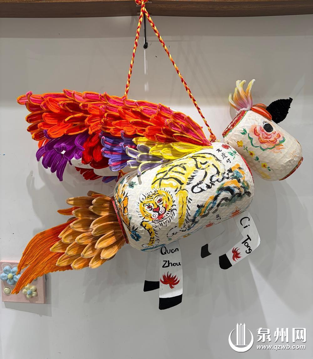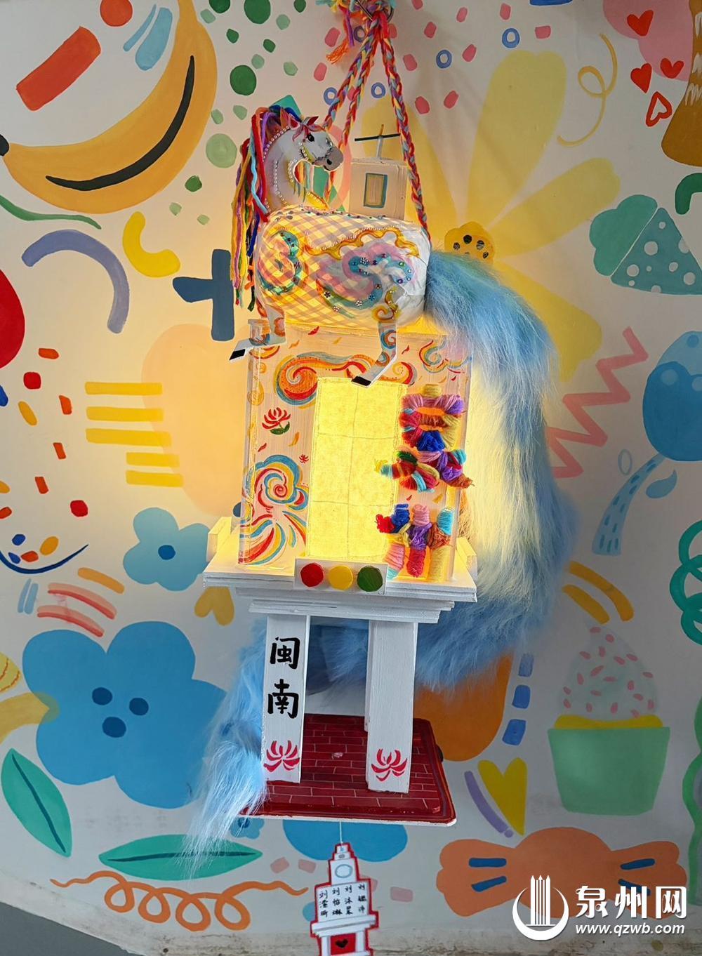 “我要让小马戴着簪花,站在钟楼上看西街!”“我要在西街钟楼添上刺桐花!”“我要在灯笼上画开元寺的飞天!”孩子们将自己的想法付诸实践,用水彩笔画下一朵朵绽放的刺桐花,花瓣边缘晕染开淡淡的绯红。老师特意用五颜六色的毛线制作了“泉州”字样的配饰,与孩子共同完成作品。花灯点亮后,暖黄色的灯光透过手绘的彩色螺旋花纹,营造出温馨氛围。充满闽南文化特色的马年主题创意手作灯笼整体造型融合了钟楼等泉州元素,顶部的骏马造型色彩斑斓,鬃毛用彩色流苏装饰,并粘贴上蓬松的蓝色马尾,既呼应了马年生肖主题,又增添了梦幻感。