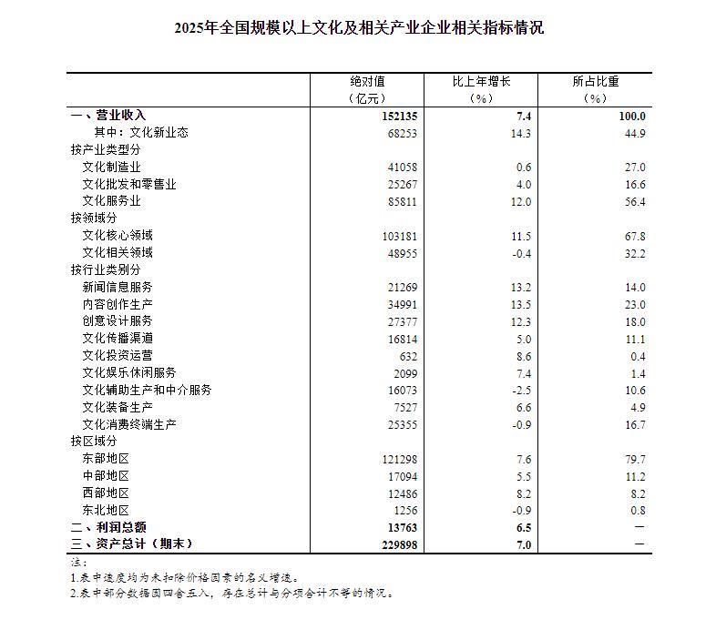 据对全国8.2万家规模以上文化及相关产业企业(以下简称“文化企业”)调查,2025年,文化企业实现营业收入152135亿元,按可比口径计算(详见附注2),比上年增长7.4%[1]。其中,文化新业态特征较为明显的16个行业小类[2]实现营业收入68253亿元,比上年增长14.3%,快于全部规模以上文化企业6.9个百分点。