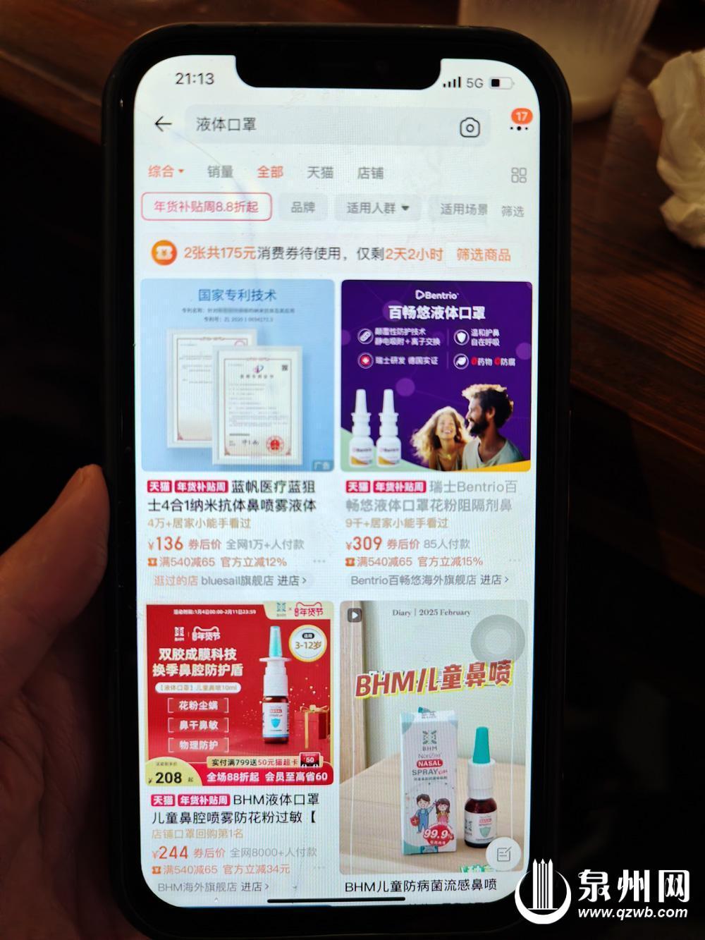 泉州网1月31日讯(融媒体记者 康云 许奕梅 文/图)寒冬岁末呼吸道疾病高发,口罩成为市民出行必备。近期,一款宣称“鼻腔喷一喷形成防护屏障,病毒阻断率99.9%”的“液体口罩”在各大电商平台走红,不少市民跟风购买。但记者走访泉州、厦门两地多家药店发现,这款网红产品线下难觅踪迹。调查证实,该产品既非药品也非医疗器械,仅为普通日用品。专家明确表示,其宣称的防护效果缺乏临床依据,儿童使用还存在过敏、误食等安全隐患。
