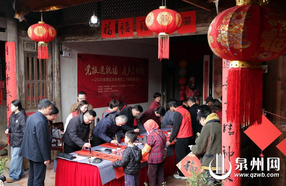 泉州网2月3日讯(融媒体记者 张雯 张九强 文/图)2月1日,2026年“党报送祝福 春联抒真情”活动在泉港区后龙镇涂坑村举行。在古厝大厅内,人头攒动、红纸翻飞,现场不仅墨香氤氲,更是年味浓浓。一副副寓意吉祥的春联,一个个饱满喜庆的“福”字,将满满的新春祝福送到职工和群众手中。