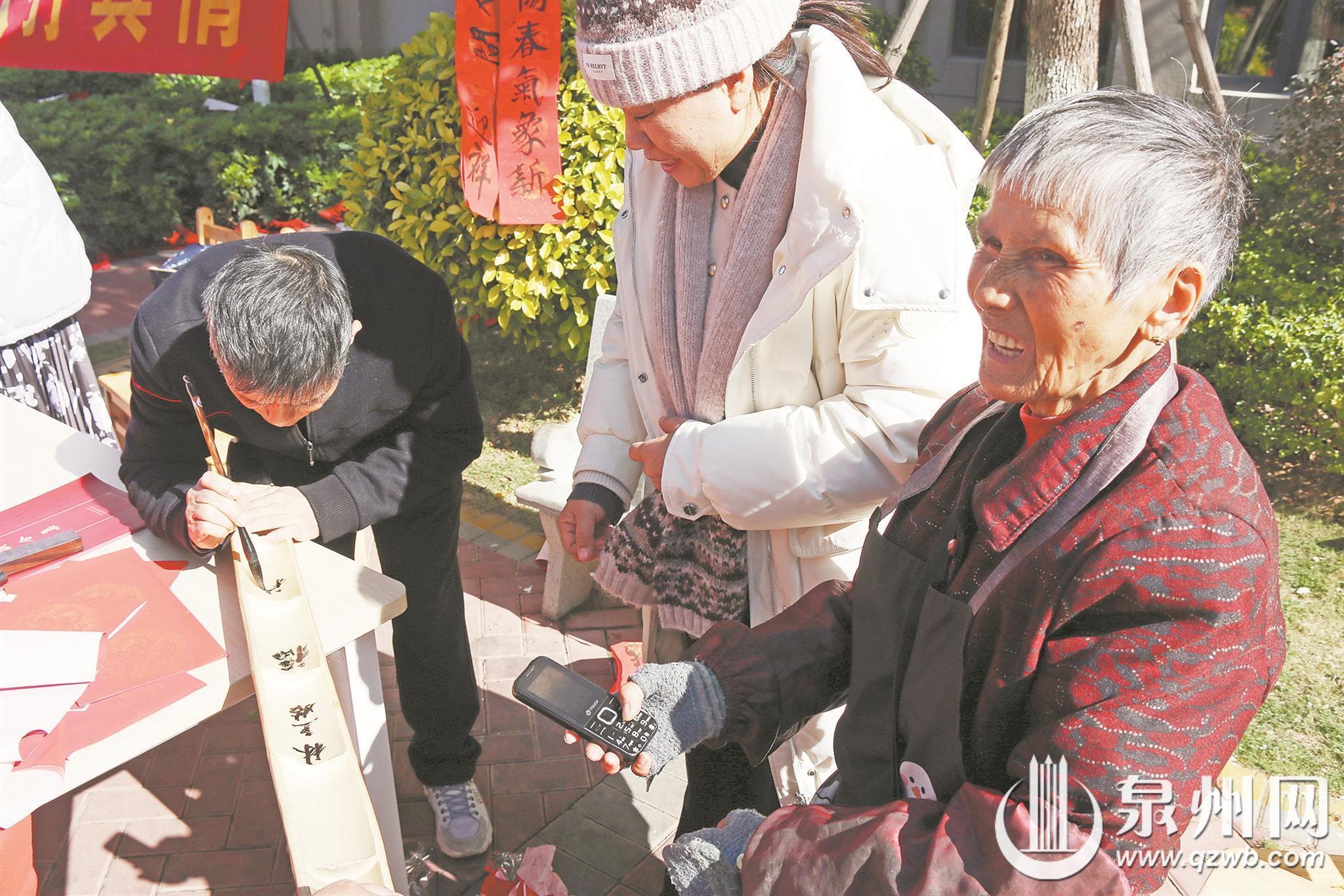 “‘马上有钱’寓意太好了,麻烦您帮我也写一张。”参与活动的泉州书法家们的桌前围满了群众。他们马不停歇地为居民们书写心仪的春联。在众多的斗方中,“马上有钱”斗方格外夺人眼球。
