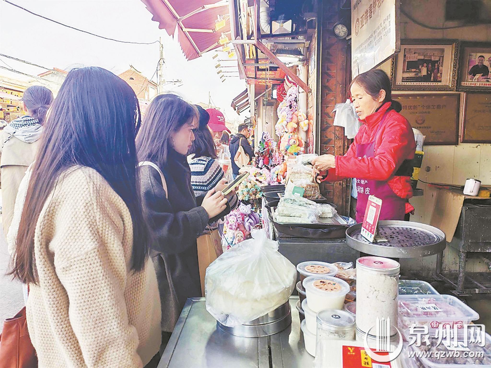 “我喜欢这种配料十足、油润不腻的口感。准备买点润饼菜食材,回家自己动手包给家人尝尝。”来自浙江的林女士边做功课边说,“我刚才逛了开元寺,现在出来打包,等下要到钟楼打卡‘地·玩玩’马年IP装置。”一个流程下来,既欣赏了古建筑,又吃到特色小吃,还打卡泉州独特马年IP装置。对于自己做的泉州旅游攻略,林女士十分满意。