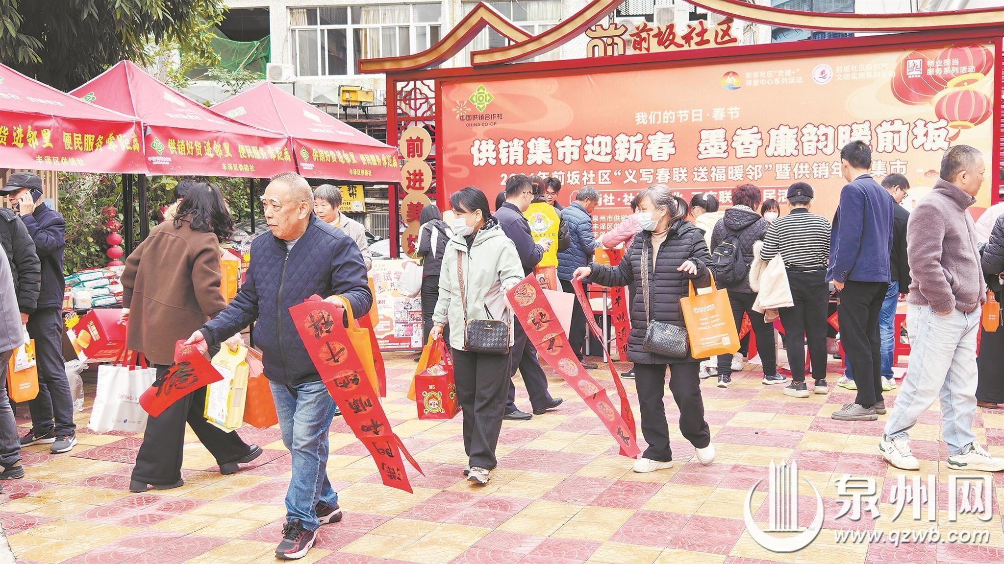 泉州网2月5日讯 (融媒体记者郭剑平 文/图)近日,丰泽区供销社联合有关单位,先后走进前坂社区、迎津社区、泉淮社区等多个社区,开展“供销集市迎新春”义写春联送福暖邻暨年货集市便民服务活动。活动以“集市+文化+服务”的创新形式开展,邀请书法家现场挥毫泼墨,共赠春联1000余副、福字600余张,传递新春祝福;集市展销特色农产品、民生年货150余种,质优价惠,销售额超12万元。此外,集市上还提供政策咨询、小家电维修、磨菜刀等多元服务,累计服务群众1300余人次,为社区居民带来一场场温馨的新春活动,彰显供销社为民服务初心,营造欢乐祥和的节日氛围。