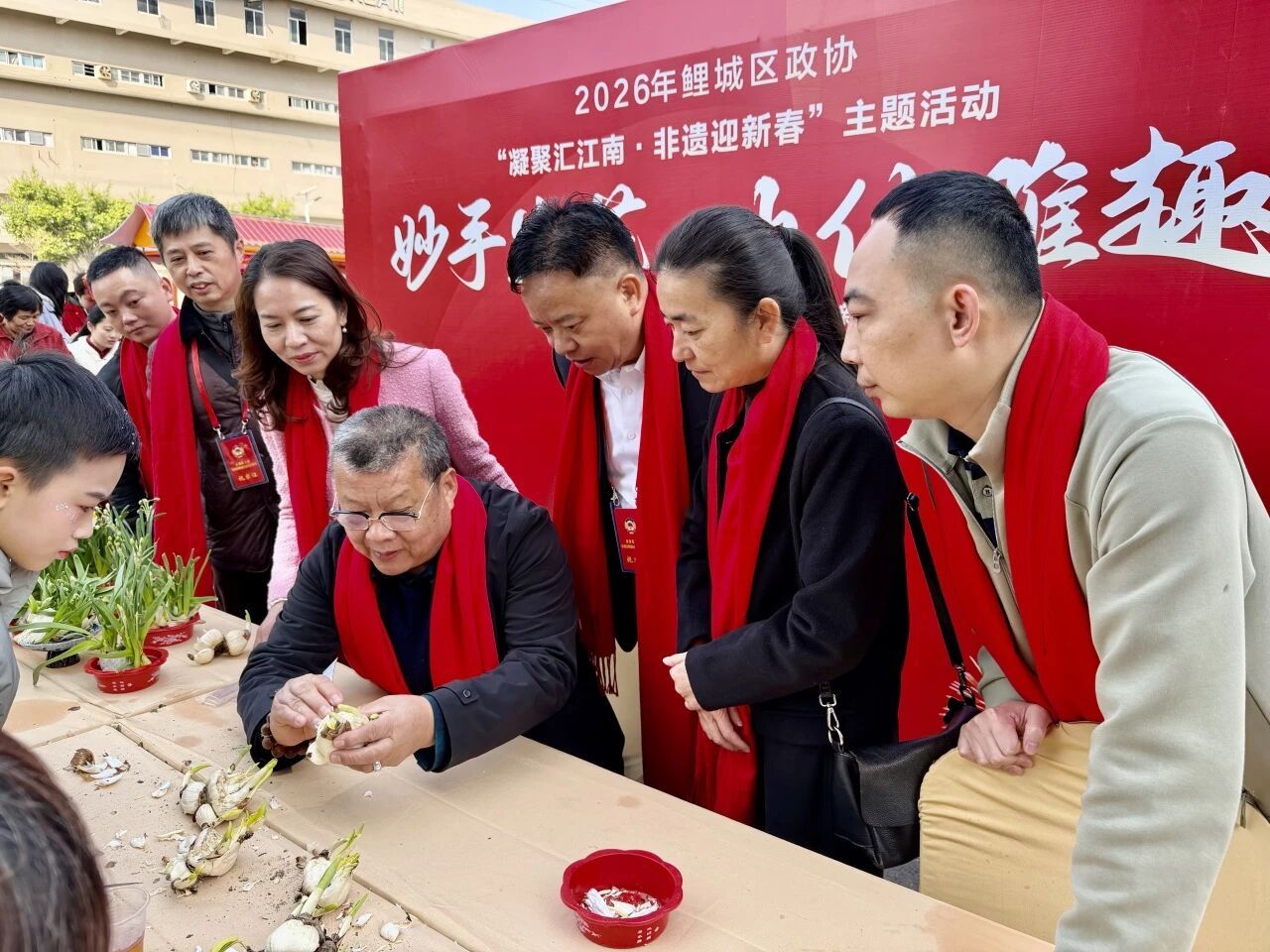 活动现场还特别设置了“新鲤城人”新春工坊互动体验区。区政协委员庄崇宏与书法家们挥毫泼墨,共同写春联、送福字;区政协老委员联谊会副会长、农艺高级技师苏剑沙指导参与者雕刻水仙花球;区政协委员、非遗传承人黄紫燕指尖灵动,在木偶头上勾画描摹,引人驻足观摩;鲤城工匠、非遗传承人曹淑贞带领群众体验剪纸、纸扎等非遗技艺;区政协委员、制茶高级工程师黄永红则展示交流茶艺。