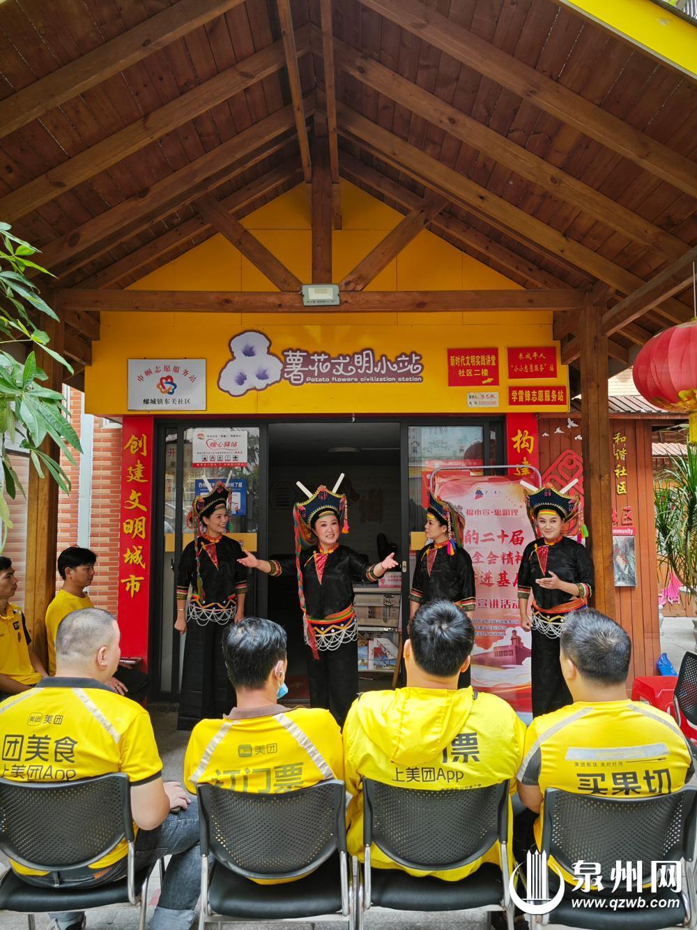 2024年10月12日,在惠安县螺城镇东关社区新时代文明实践站,惠女快板队的文艺宣讲节目《党的二十届三中全会赞》深入人心。