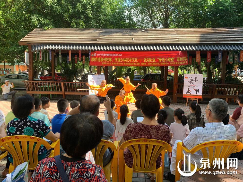 2024年8月1日,丰泽区东湖街道圣湖社区“厝边党史小课堂”特邀泉州少林寺武僧团现场展示少林武术魅力。