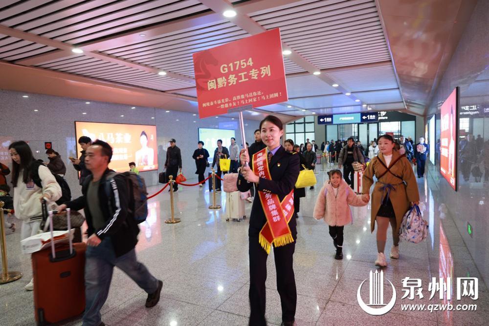 泉州网2月6日讯(融媒体记者张晓明 通讯员胡寻风 文/图)昨日8时53分,G1754次“青春遇见贵州·团圆号”免费返乡高铁专列搭载395名贵州籍在泉务工青年,从泉州南站准时发出,驶向贵阳北站。据悉,该专列由共青团贵州省委与中国铁路南昌局集团有限公司漳州车务段等多方联合组织开行,在春运大潮中,为在泉州辛勤打拼的贵州籍务工人员铺就了一条温暖、便捷的团圆之路。