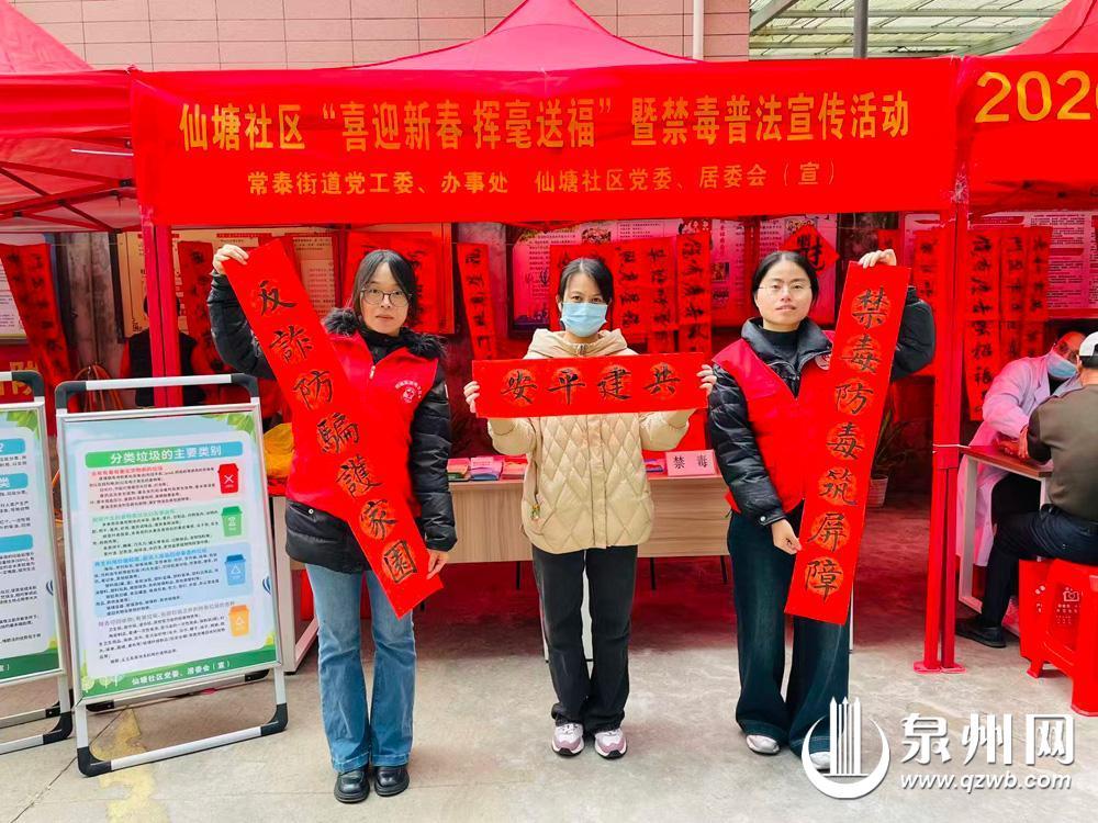 泉州网2月6日讯(融媒体记者许奕梅 通讯员黄梅凤 文/图)新春佳节将至,为营造平安祥和的节日氛围,全面提升辖区居民防范电信网络诈骗及抵御毒品侵害的意识和能力,在鲤城公安分局禁毒大队的指导下,常泰街道仙塘社区于2月2日开展“喜迎新春 挥毫送福”暨禁毒普法宣传活动,为居民群众送上年味满满的“禁毒文化年货”。