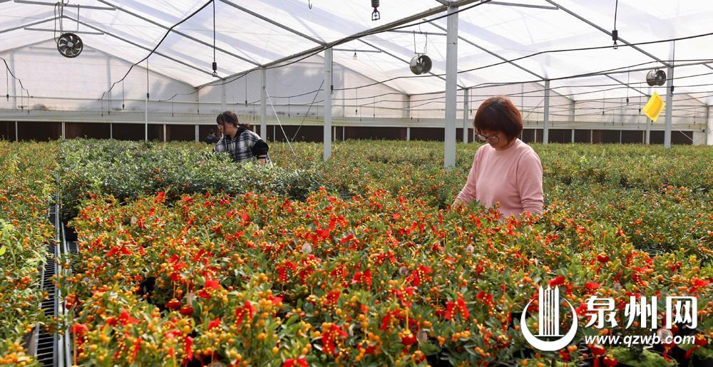 新春佳节将至,永春县岵山镇海峡花卉产业园内的特色花卉——永春“金豆”盆栽,凭借古朴雅致的观赏质感和富贵吉祥的寓意,成为年宵花市场的热销产品,众多爱好者通过网购、直销等方式购买。据了解,该产业园的永春“金豆”盆栽主要销往福建、广东、上海、北京、山东等地,日均销售2000多盆。图为工人正在为永春“金豆”盆栽挂上红灯笼等吉祥挂饰。 (融媒体记者陈小阳 通讯员康庆平 摄)