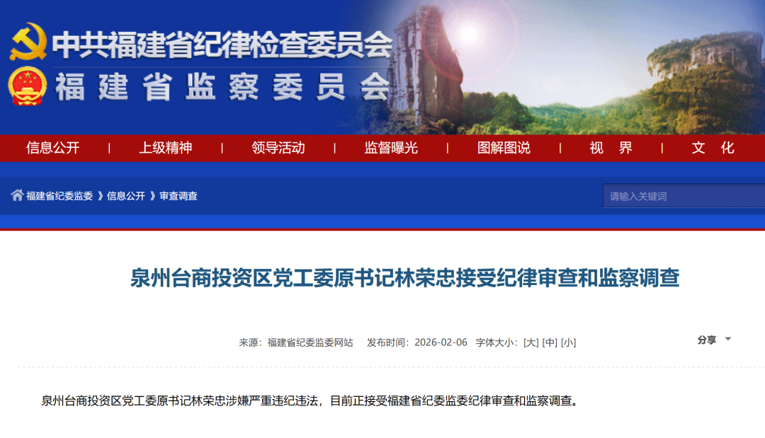 据福建省纪委监委2月6日消息,泉州台商投资区党工委原书记林荣忠涉嫌严重违纪违法,目前正接受福建省纪委监委纪律审查和监察调查。