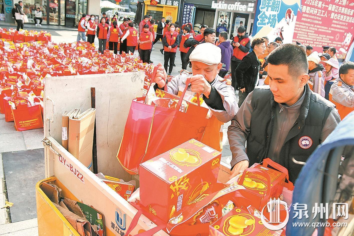 昨日上午,2026年第11届晋江青阳街道春节慰问环卫工公益活动在阳光时代广场举行,现场为300名环卫工发放由大米、花生油、面包等组成的爱心年货“大礼包”。此次活动由青阳街道党工委、晋江市青阳庄紫祥慈善基金会、晋江青年志愿者协会圆爱服务队等共同组织举办。 (融媒体记者陈明华 摄)