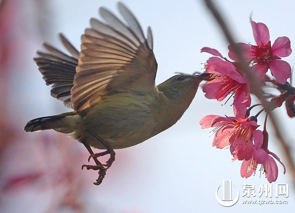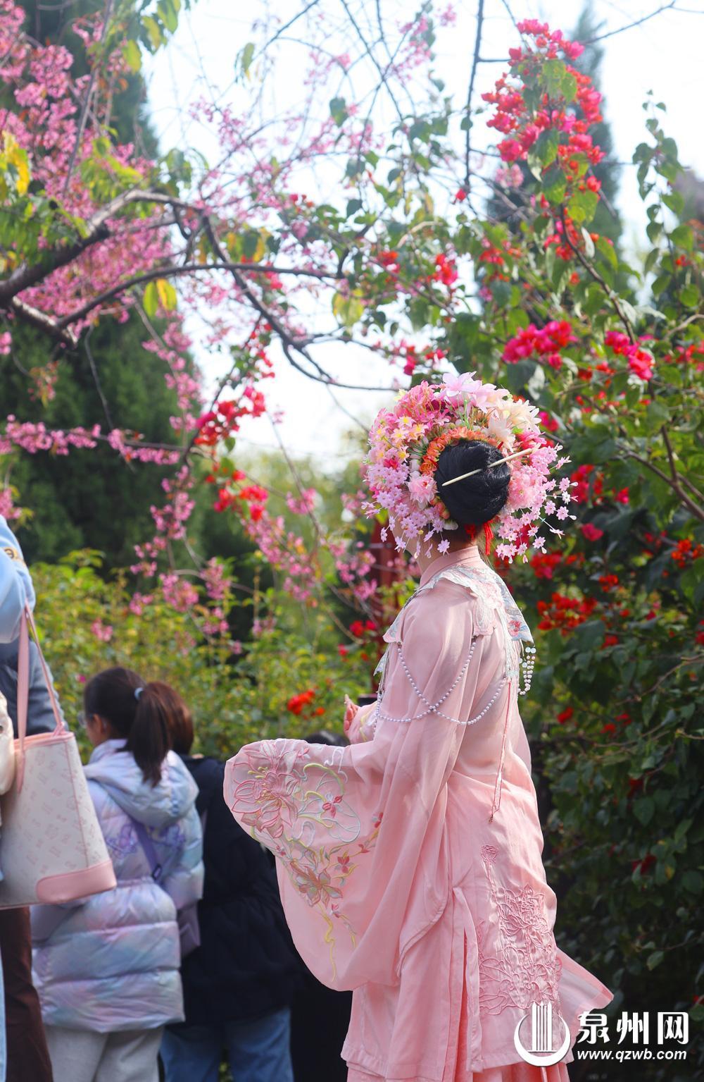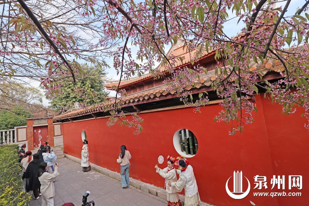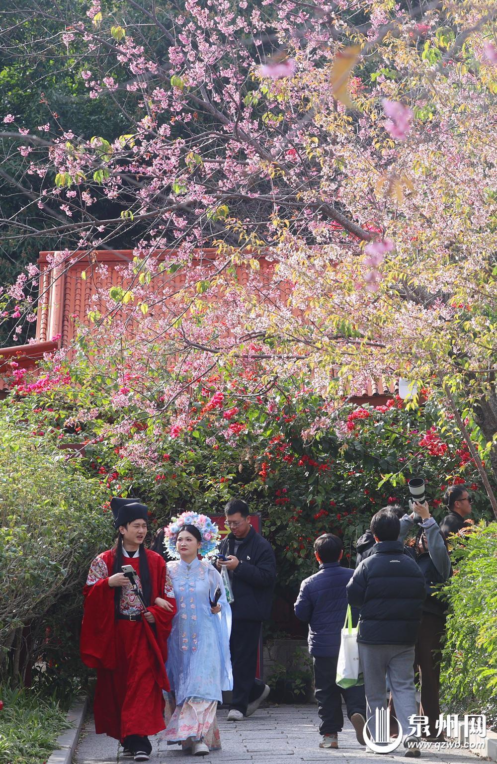 连日来,泉州开元寺西塔旁的早樱悄然绽放,为千年古刹点缀上灵动的春色。预计春节前后,寺内更多的樱花将陆续开放,届时可望迎来一片烂漫的粉红景致。(王柏峰 摄)