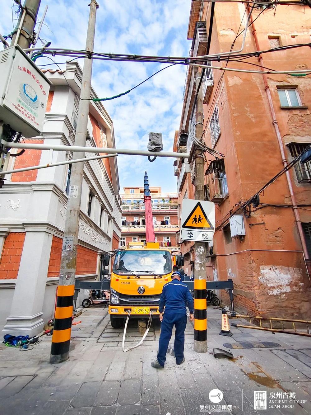 井亭巷全长约420米,是泉州古城传统生活街区的重要组成部分,周边居民区、学校密集,日常交通压力较大。受历史因素影响,街巷内老旧架空线路纵横交错,占道的路中电线杆不仅影响居民出行,更暗藏安全隐患,与古城古朴风貌格格不入。在泉州市古城保护发展指挥部统筹指导下,泉州文旅集团权属泉州古城公司以古城活态保护理念为指引,牵头推进井亭巷电力配套提升工程,聚焦线缆下地、杆线拆除、开闭所建设三大核心任务,回应群众改善街巷环境、保障出行安全的诉求。