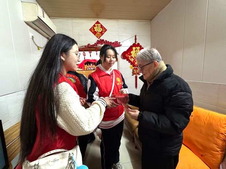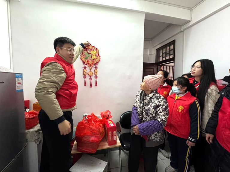 活动聚焦孤寡独居、高龄及生活困难老年群体,采用“物资+服务”双轨帮扶模式。志愿者逐户走访,向老人发放包含米面粮油、营养食品的生活礼包,并附赠手写春联、福字挂饰等节庆用品及慰问金。针对行动不便的老人,团队主动提供个性化服务,如协助张贴春联、布置家居,现场询问生活需求,确保关怀精准落地。在清正社区,82岁的董爷爷接过物资后感慨:“快过年了,谢谢你们来看我。”志愿者随即为其装饰门窗,同时聆听老人讲述闽南年俗。活动中,学生通过参与节庆布置、倾听传统故事等方式,直观感受敬老文化,深化社会责任意识。