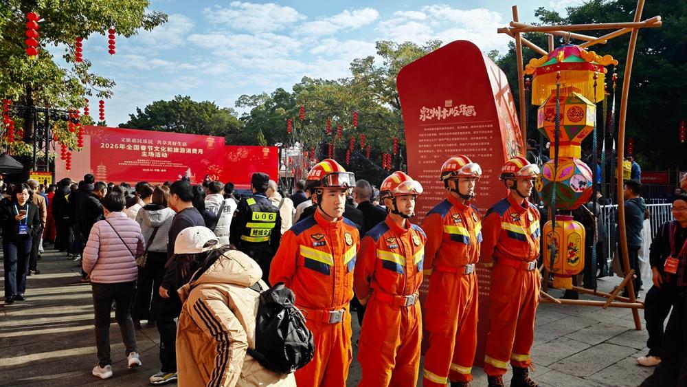 鲤城区古城消防救援站青年突击队在府文庙“2026年全国春节文化和旅游消费月·主场活动”执勤安保