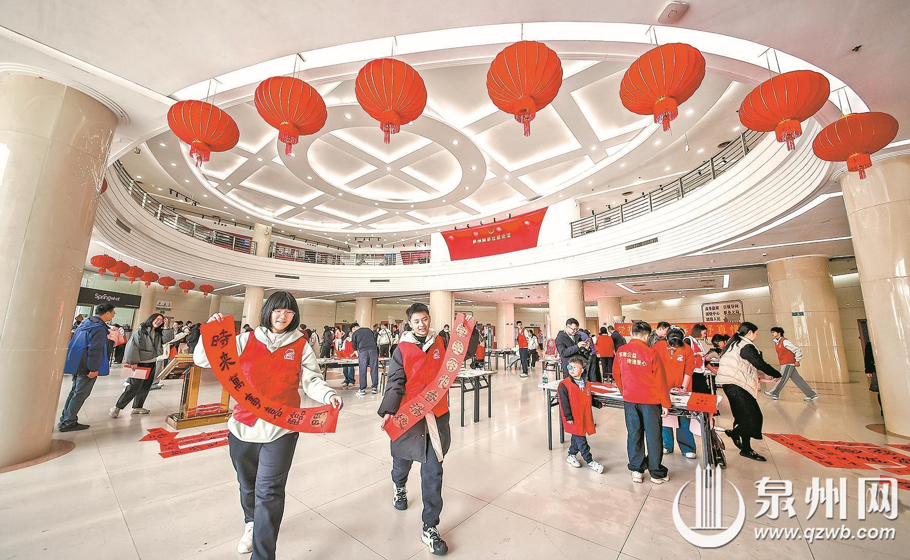 活动中,泉州市东南公益协会的学生志愿者们身穿志愿服在大厅里忙前忙后,有的耐心为到来的市民介绍领联流程,有的帮忙传递红纸和晒干春联,他们用热情饱满的姿态,为活动的有序进行贡献着一份力量。