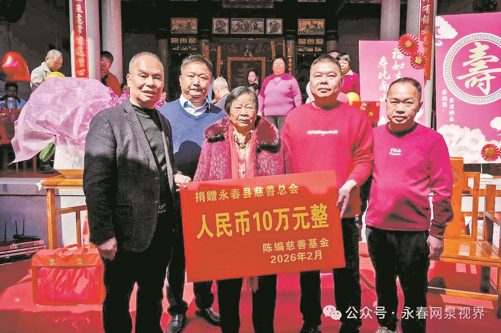 泉州网2月12日讯 (融媒体记者陈玲红 通讯员郑志林 文/图)2月10日,永春县东关镇外碧村登春堂内张灯结彩、暖意融融,陈编老人九十大寿祝寿宴在此隆重举行。在满堂亲友的共同见证下,一场饱含深情的爱心捐赠温暖全场——陈编老人家属代表以“陈编慈善基金”名义,向永春县慈善总会现场捐赠善款10万元,以大爱之举为九秩寿辰写下厚重且动人的篇章。