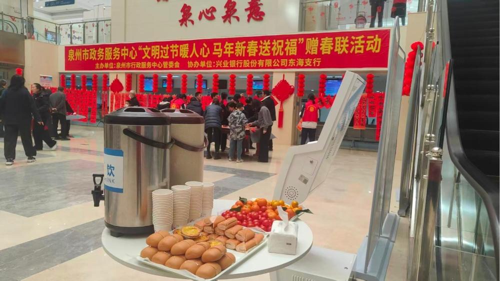 东海支行则联合泉州市行政服务中心管委会举办了泉州政务服务中心“文明过节暖人心 马年新春送祝福”赠春联活动,邀请来往客群许下新春愿望,并奉上茶水点心。