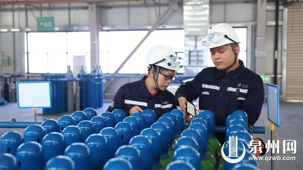 宇极对气体钢瓶数字化管理,气体产品全流程可追溯。图为仓储员工正在对气体钢瓶进行扫码检查。