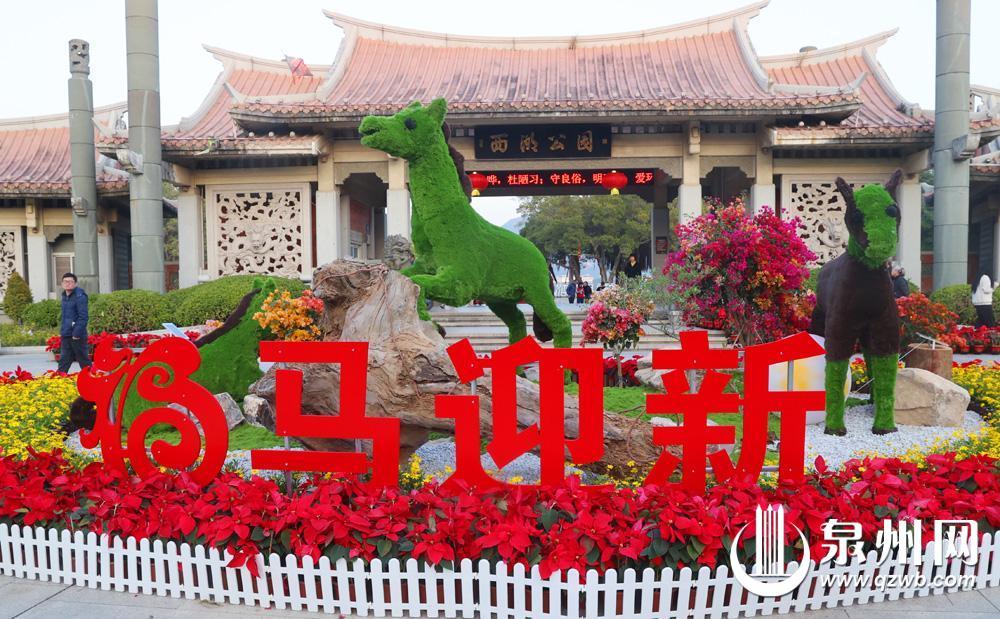 春节临近,泉州市区各大公园悬挂红灯笼、摆放鲜花,将公园装扮一新。图为西湖公园门口的“福马迎新”景观。(王柏峰/摄)
