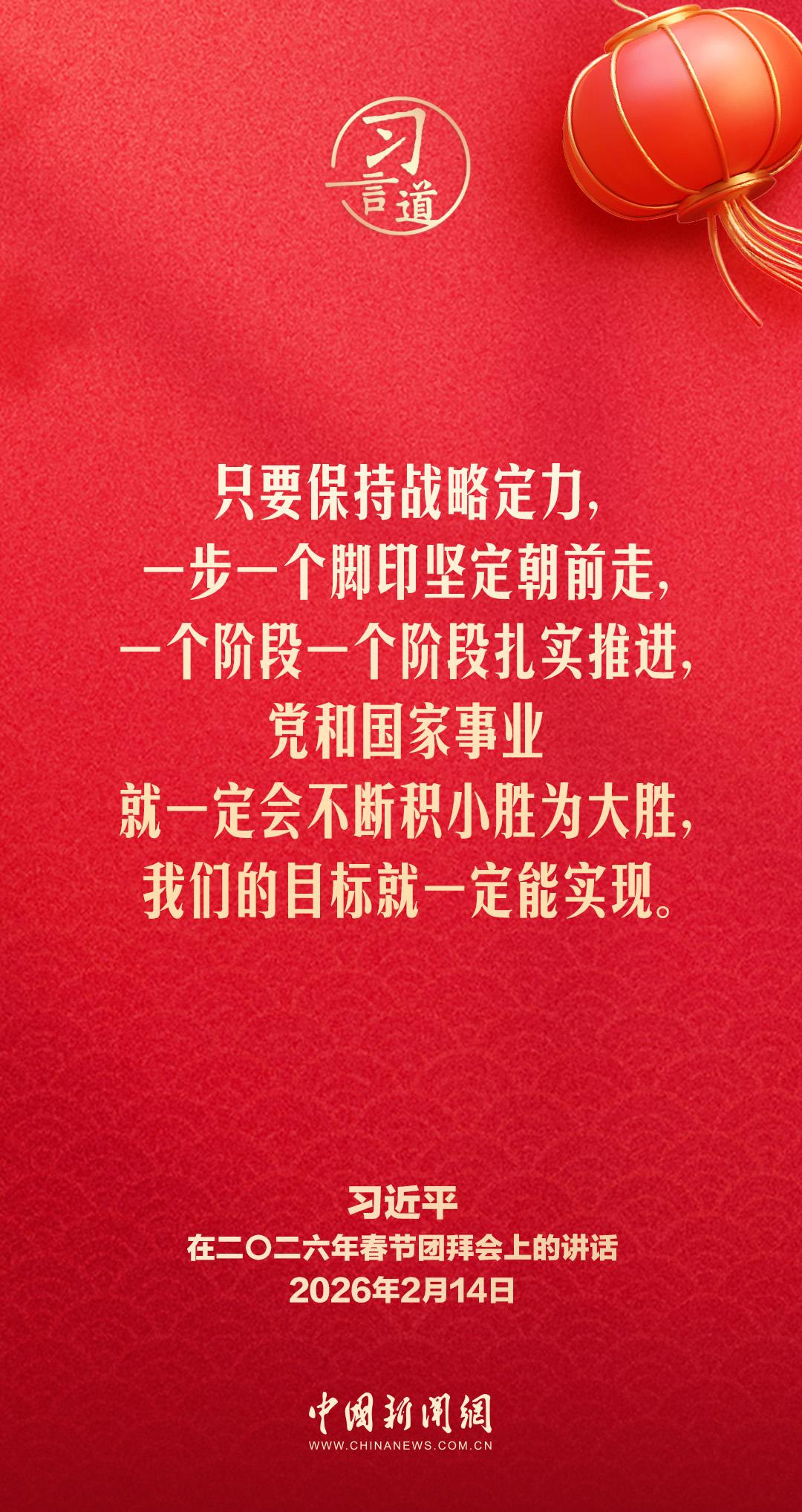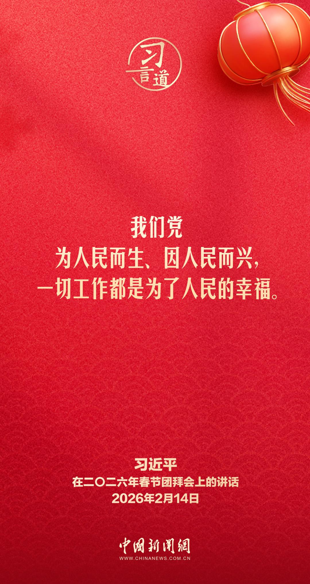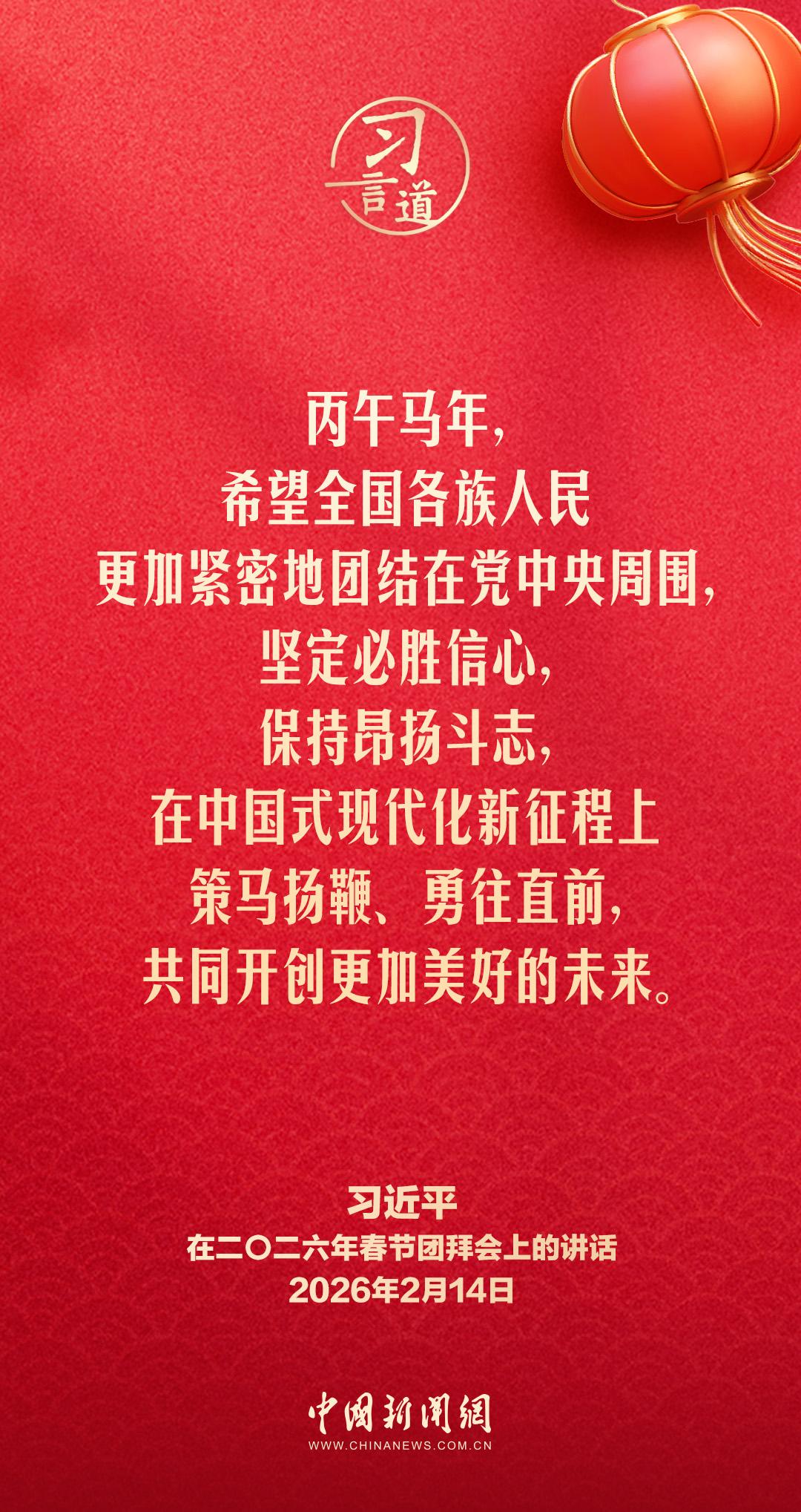 2月14日,中共中央、国务院在人民大会堂举行2026年春节团拜会。中共中央总书记、国家主席、中央军委主席习近平发表讲话,代表党中央和国务院,向全国各族人民,向香港特别行政区同胞、澳门特别行政区同胞、台湾同胞和海外侨胞拜年。他指出——