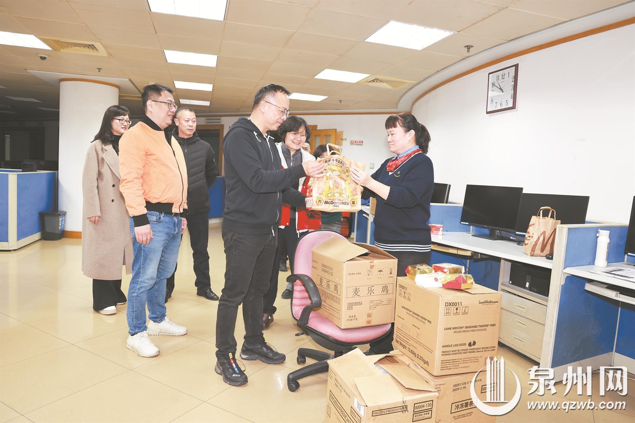 2月16日晚上,麦当劳泉州公司给泉州晚报社编辑部送来年夜饭,慰问除夕坚守一线岗位的新闻工作者。 (融媒体记者陈英杰 摄)