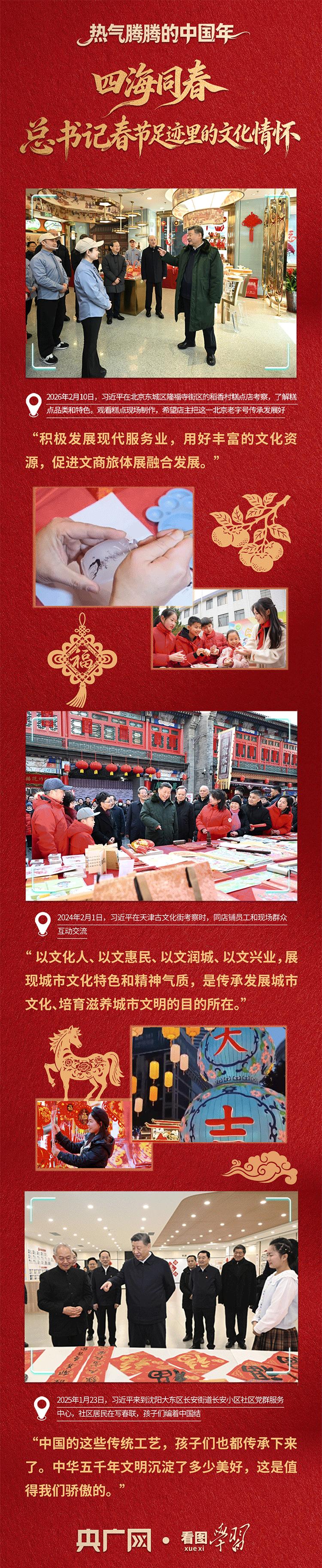 在云南佤族村落,同乡亲们一起制作新年传统食物大米粑粑;在北京草厂四条胡同,为一户居民家门贴上一幅红底金色的“福”字;在内蒙古冬季那达慕大会上,与牧民们一起观看摔跤赛马,听长调、赏歌舞,为大家送上美好祝福……这些充满温情的互动,饱含着总书记对人民的关爱、对传统文化保护和传承的重视。