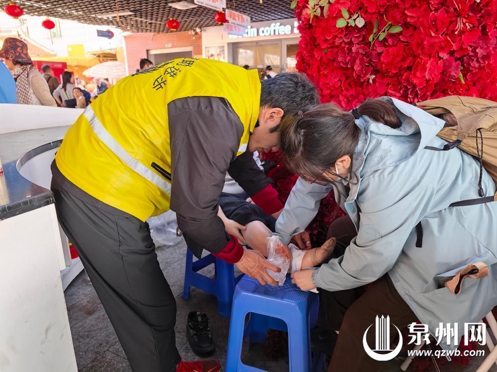 节日期间,景区内游客摩肩接踵,然而意外也潜藏其中。20日上午10点,泉州市急救指挥中心志愿者服务队队长蔡凤玉刚结束一轮流动巡查,便遇到一位焦急万分的女游客——她的小女儿因鞋子过紧,脚趾肿痛且渗血。蔡凤玉与志愿者杨仲泽、陈燕钦迅速行动,他们用碘伏轻柔地为小女孩处理伤口。在他们的悉心照料下,小女孩的哭声渐止,脸上重新绽放出笑容。