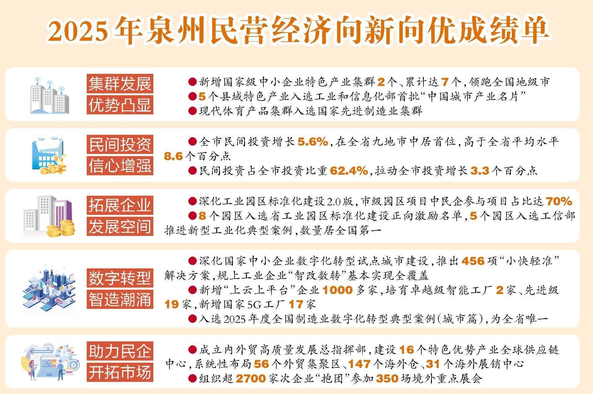 今年1月,泉州印发《关于实现2026年一季度经济社会发展良好开局的若干措施》,从持续提振消费、加力扩大有效投资、促进实体经济稳定增长等多方面推出34条具体措施。其中,在激发民间投资活力方面,明确加大力度向民间资本推介优质重大项目,力争一季度全市新增储备推介项目总投资超10亿元。在优化企业融资支持上,引导更多金融资源向民营企业倾斜,做大民营企业贷款规模;继续发挥支持小微企业融资协调工作机制作用,开展银企对接,用好中小微企业融资增信基金等,为民营企业注入“金融活水”。