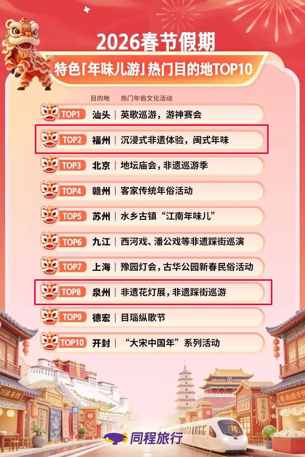 福州春节期间以“来福州,过福年”为主题,举办新春文化旅游月,实现年味、灯会、非遗、烟花、古厝、红色旅游全覆盖,成为今年春节“年味儿”旅游热的大赢家。同程旅行23日发布的《2026春节假期旅游消费盘点报告》显示,福州跻身“特色年味游”TOP10目的地榜单第二名,网友评价“感觉江浙沪粤人民集体来到福州过年”。泉州以“泉州非遗年·生活加点甜”为主题开展系列活动,在高德地图、小红书、马蜂窝等平台均入选年味城市TOP10。