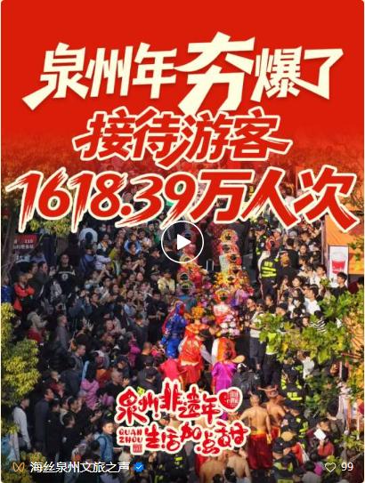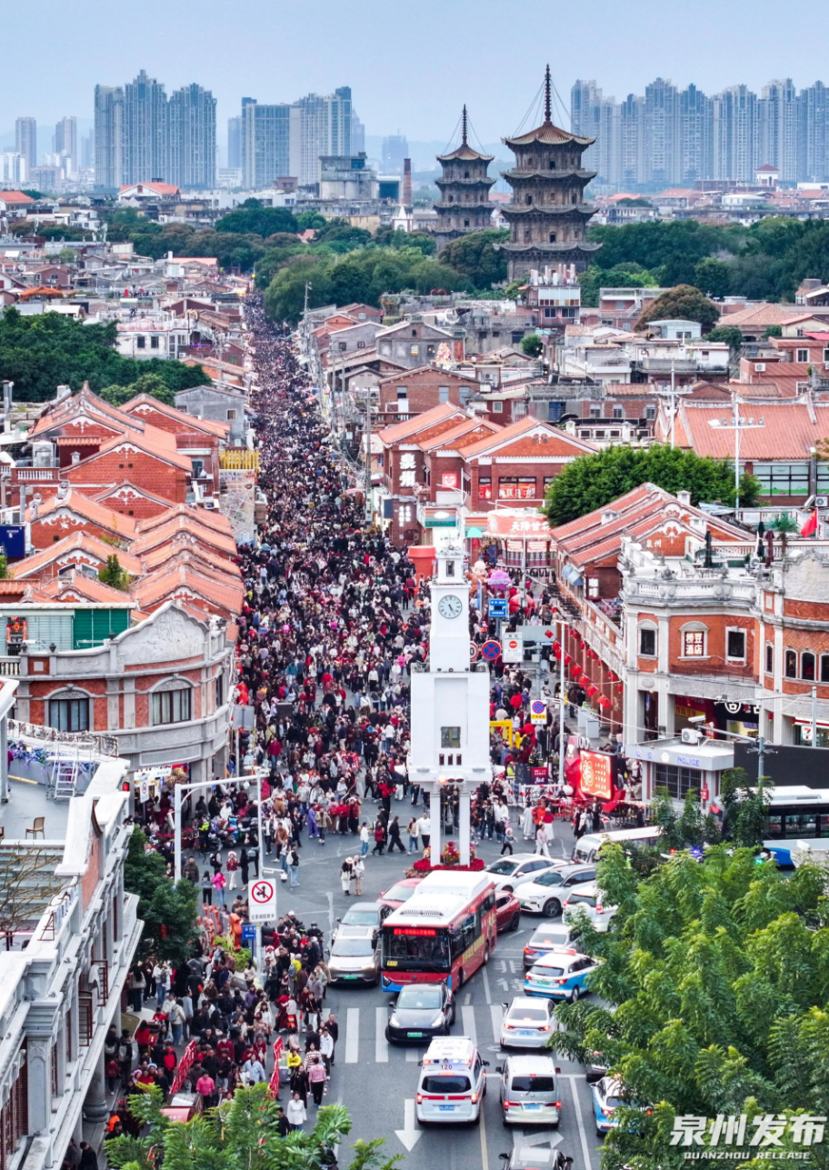 2026年春节假期,全市紧扣“泉州非遗年·生活加点甜”主题,推出“东方第一大港书院行”春节主题活动,围绕“满城非遗”“浪漫烟火”“文创体验”“闽南美食”“国潮时尚”“暖心服务”等,全域联动推出超1000场文化和旅游活动、超5亿元消费让利,文旅市场供需两旺、“马”力全开、强势领跑,客流消费双增长、品质体验双提升。