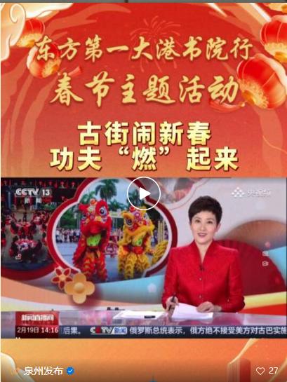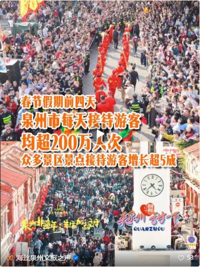 主流媒体新媒体高度聚焦。央视总台《新闻联播》《新闻直播间》《朝闻天下》等栏目以及人民日报、新华社等国家级主流媒体高频次、多角度聚焦泉州春节非遗街秀、世遗年味、特色花灯、文旅消费、国际传播等亮点报道100余次,泉州智造机器人登上央视春晚,五祖拳、白鹤拳登上央视非遗晚会,打城戏登上央视戏曲晚会,簪花围登上全球华人华侨春节大联欢,《马到成功·中国年》《远方的家》《三餐四季》等特别节目聚焦泉州文旅。“泉州文旅才是真的懂爱你老己”“游客专门来泉州体验非遗年”“春节来泉州看非遗街秀”“在泉州拍了拍马上成功”相关话题多次登上抖音、微博等平台热门榜单。