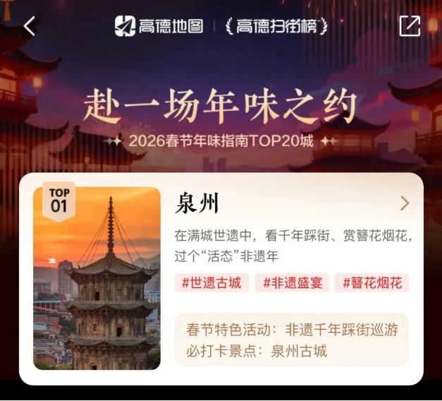 引领全国新春文旅爆款目的地第一方阵,入榜高德地图《2026春节年味指南》全国年味城市TOP1、小红书问一问年味浓的城市TOP1、马蜂窝“年味儿”热门目的地榜单TOP2、美团旅行热门非遗年俗文化体验热门目的地TOP6、中国旅行社协会传统文化游热门目的地TOP10、去哪儿旅行春节酒店预订增速全国TOP7、携程2026春节国内长线游热门目的地TOP10 、同程旅行“新春非遗旅游热门城市榜”TOP3及“年味儿游”十大热门目的地TOP8。