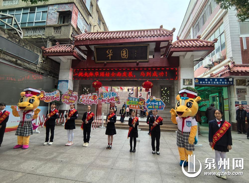 昨日一早,泉州市第三实验小学的校门口便热闹起来,手持“开学大吉 前程似锦”“新学期 加油呀”等欢迎牌的同学们及吉祥物在校门口迎接萌娃欢乐归校,学校还专门为上学期暂未获得年段及以上奖项的孩子定制了印着“不必追光,你本是光”等各种鼓励标语的书签。