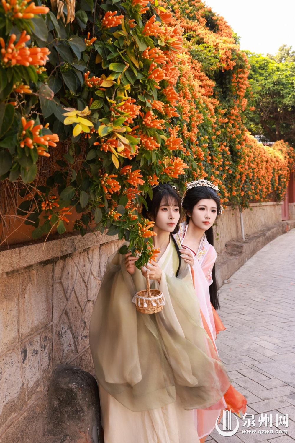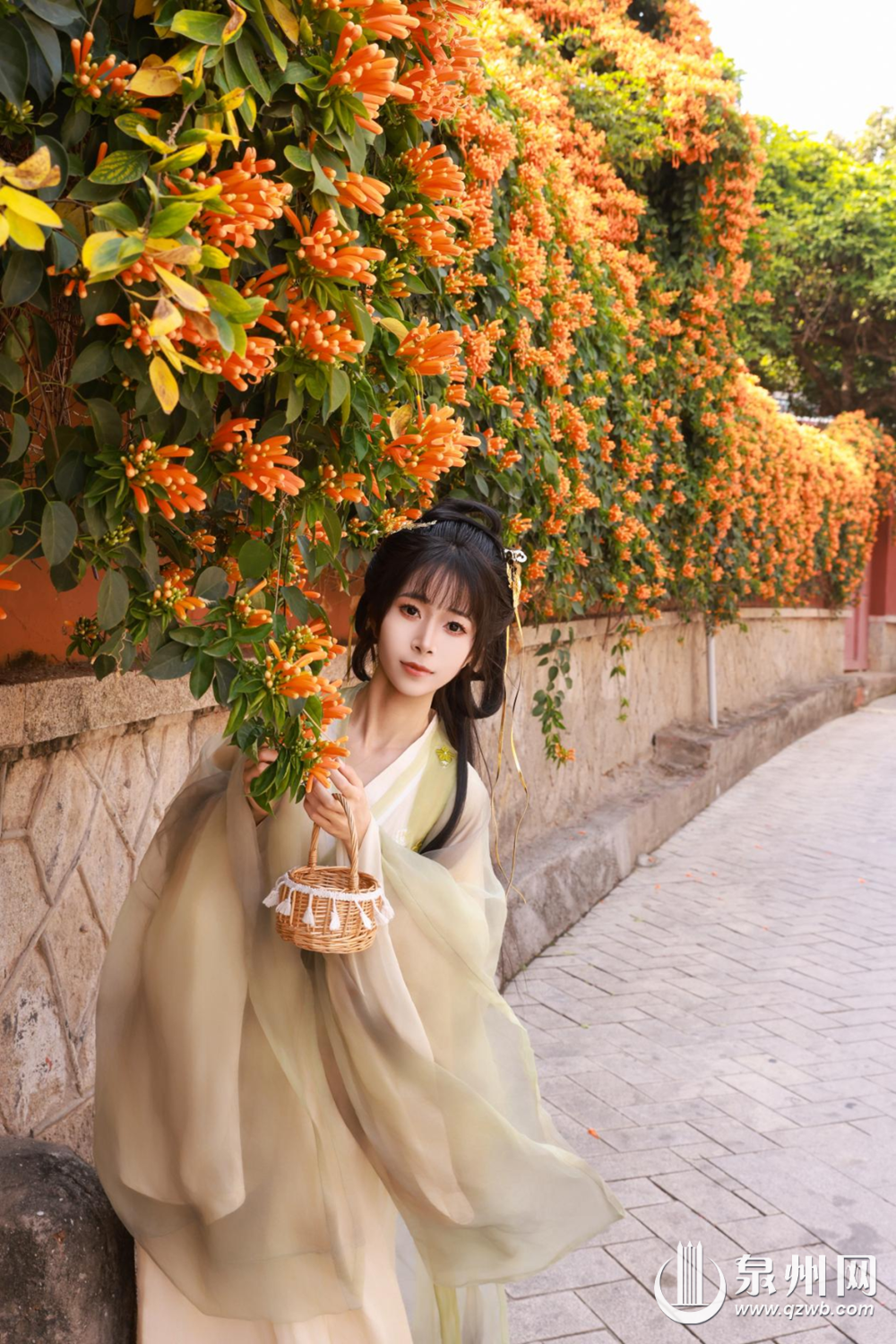 还有不少年轻姑娘盛装出席,她们身着传统服饰在花墙前摆出各种姿势,寻找最佳的拍照角度,身上的汉服与古墙、橙花相映成趣,氛围感拉满。