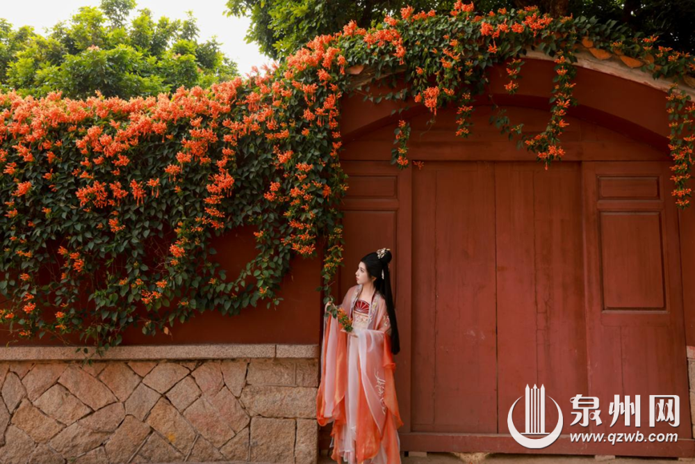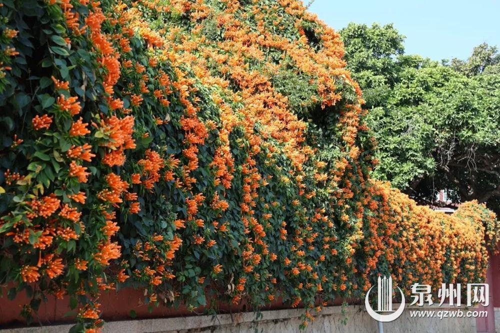 泉州网2月27日讯(融媒体记者王金植 通讯员赖淑玲 文/图)春意初绽,寒意未消。近期,一片惊艳的“橙红瀑布”正从洛江区万安街道桥南古街一侧的围墙上倾泻而下,数百串炮仗花热烈绽放,将建筑古迹装点成新春最亮眼的风景线。