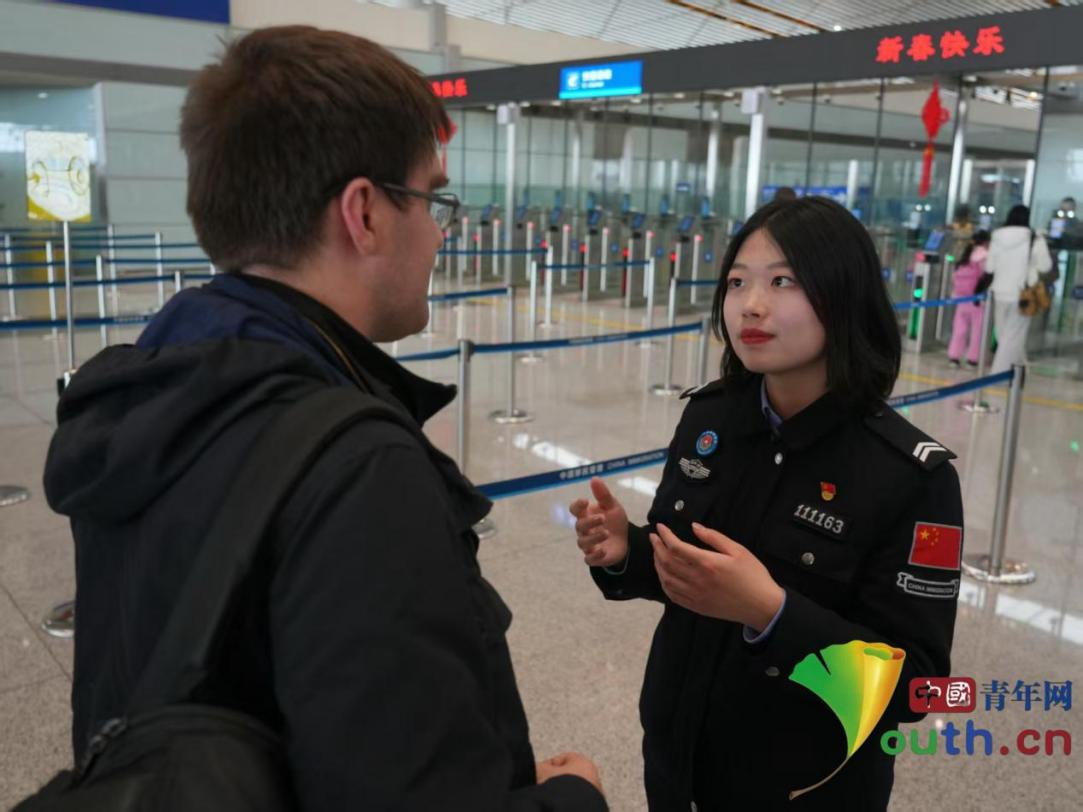 何洋服务外国旅客。中国青年网通讯员 任申 摄
