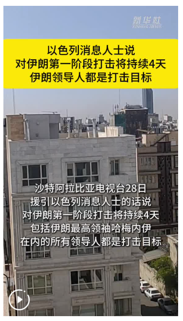 新华社快讯:沙特阿拉比亚电视台28日援引以色列消息人士的话说,对伊朗第一阶段打击将持续4天,包括伊朗最高领袖哈梅内伊在内的所有领导人都是打击目标。