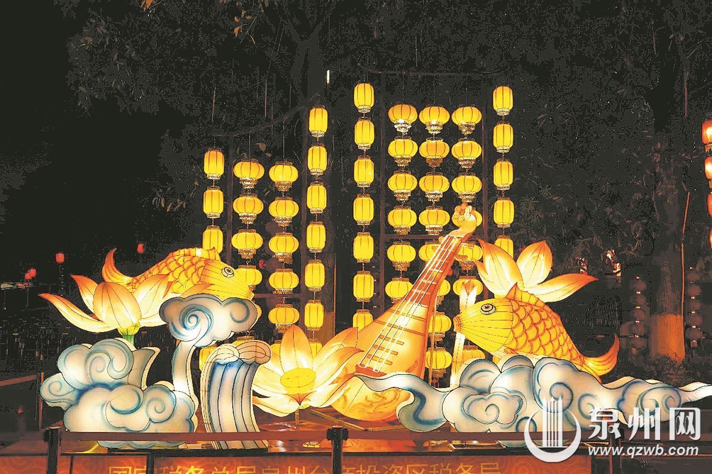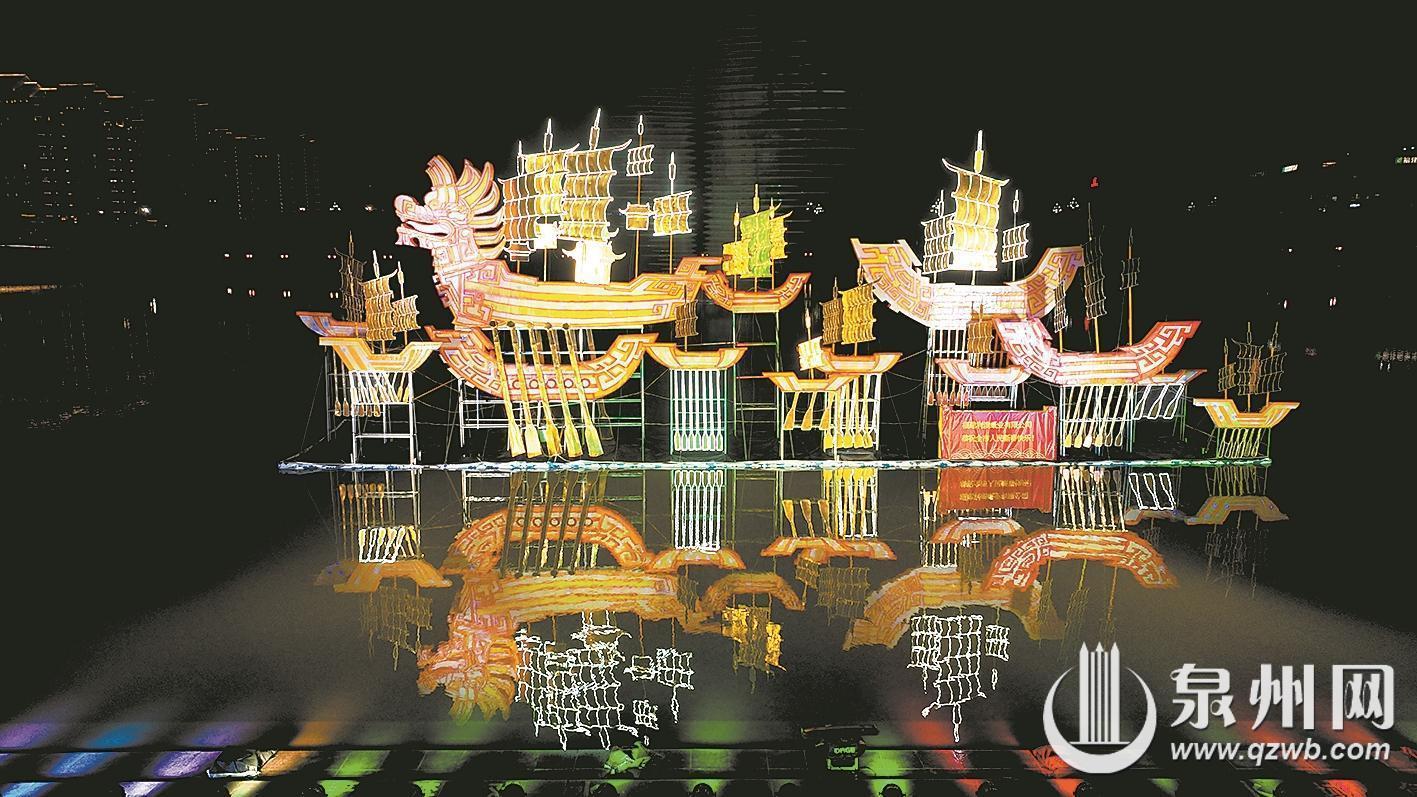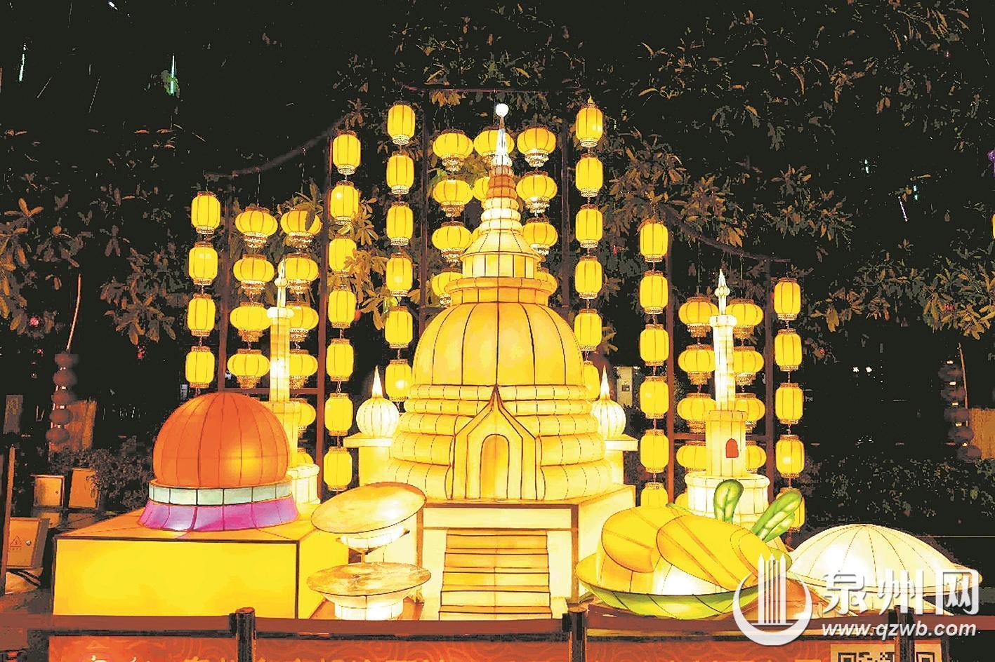 沿着水镜广场两侧步道前进,多座中小型座灯以“海丝商贸图景”与“市井巷陌烟火味道”作为两大叙事轴线,融合海丝历史、市井美食等各类元素。市民游客在花灯的指引下,可以感受“市井十洲人”“海丝商贸图景”的千年繁盛。同时,在海丝艺术公园周边道路,近60盏传统和自制花灯各具特色,为非主灯区增加了点缀。
