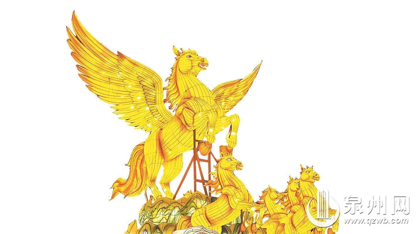 水镜广场另一端,一匹“黄金飞马”振开双翼,率领马群踏浪腾云,昂首迈蹄。陆上座灯组“马到成功”以马年生肖文化为核心,荷花与金元宝环绕底座,象征着马年奋进,破浪前行,彰显出吉庆与豪迈共生的东方气派。两大主题灯组一水一陆,共同构成本次灯会活动的视觉地标。