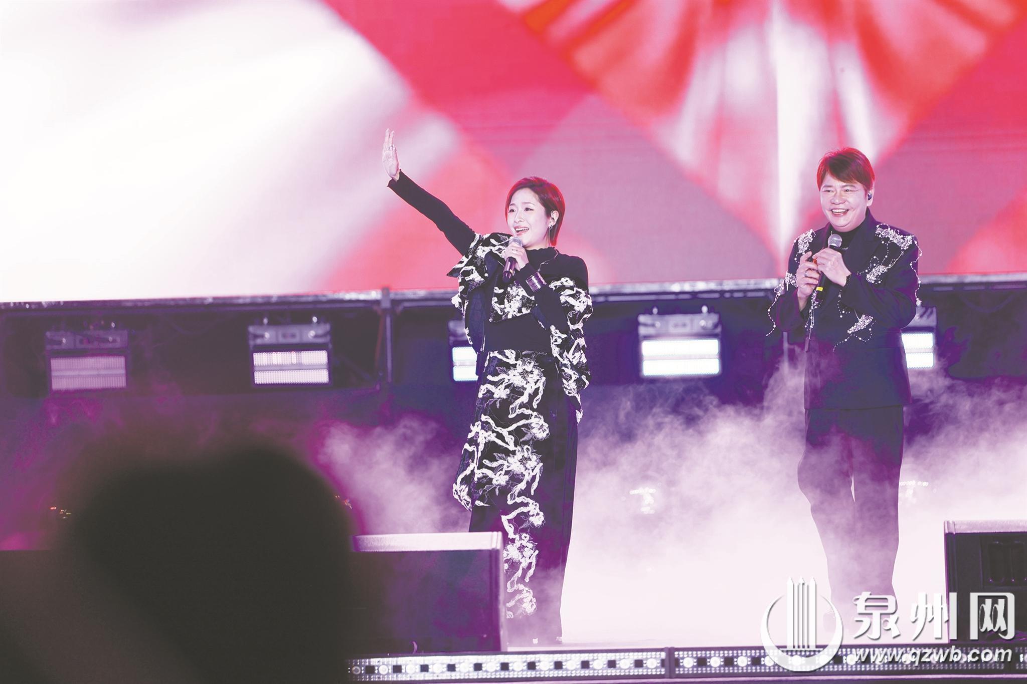 晚会阵容星光熠熠,台湾、泉州两地实力艺人携手登台,多元音乐风格碰撞交融,既有经典老歌的情怀,也有潮流旋律的活力,为现场观众带来了一场走心又过瘾的视听享受。青春组合南拳妈妈一登场,带来《下雨天》《香草吧噗》《家》经典联唱,瞬间拉满青春氛围,唱响两岸共同的青春情怀;闽南语流行音乐代表袁小迪接连唱响《重出江湖》《纸云烟》,一句句耳熟能详的歌词满含情怀,台下不少观众跟着节奏轻轻哼唱,回忆满满;台湾金曲歌王萧煌奇一开口,《你是我的眼》《阿嬷的话》等熟悉旋律萦绕全场,深情又有力量的嗓音藏着真挚的情感,令观众动容。
