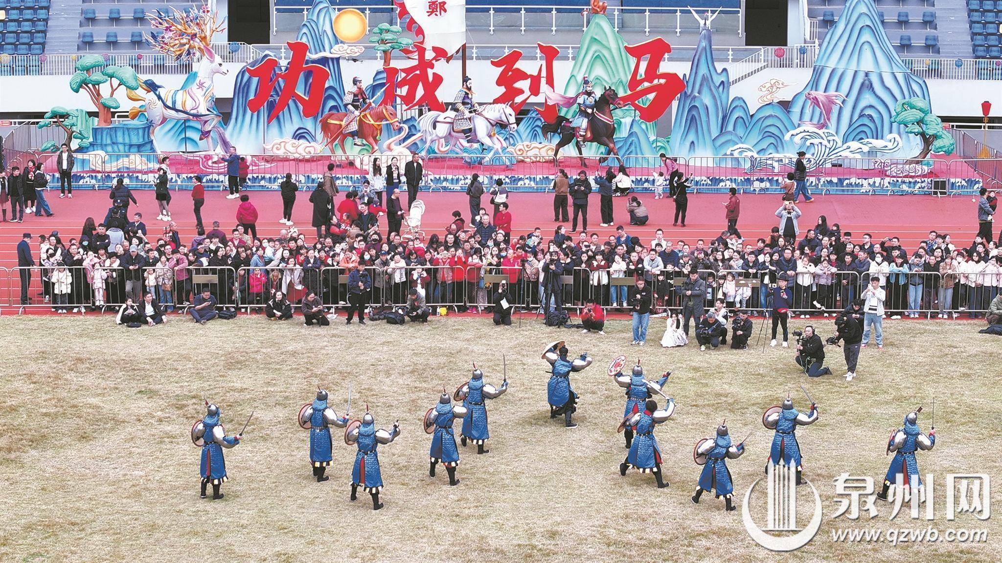 在江北片区,3日至4日举行的2026南安武荣集游园会让南安新体育场充满武荣古风。集游园会以“成功文化”为核心,将汉服妆造、甲胄手工、扇子拓印、成功文创等体验项目供市民一站式解锁国风乐趣。最为重磅的当数《武荣怒潮》成功甲骑实景剧,剧中郑成功与部将身着甲胄,策马奔腾、沙场练兵、选拔部将、驱敌护民,守护武荣千家万户的安宁幸福,让人沉浸式感受郑成功的爱国爱民精神。