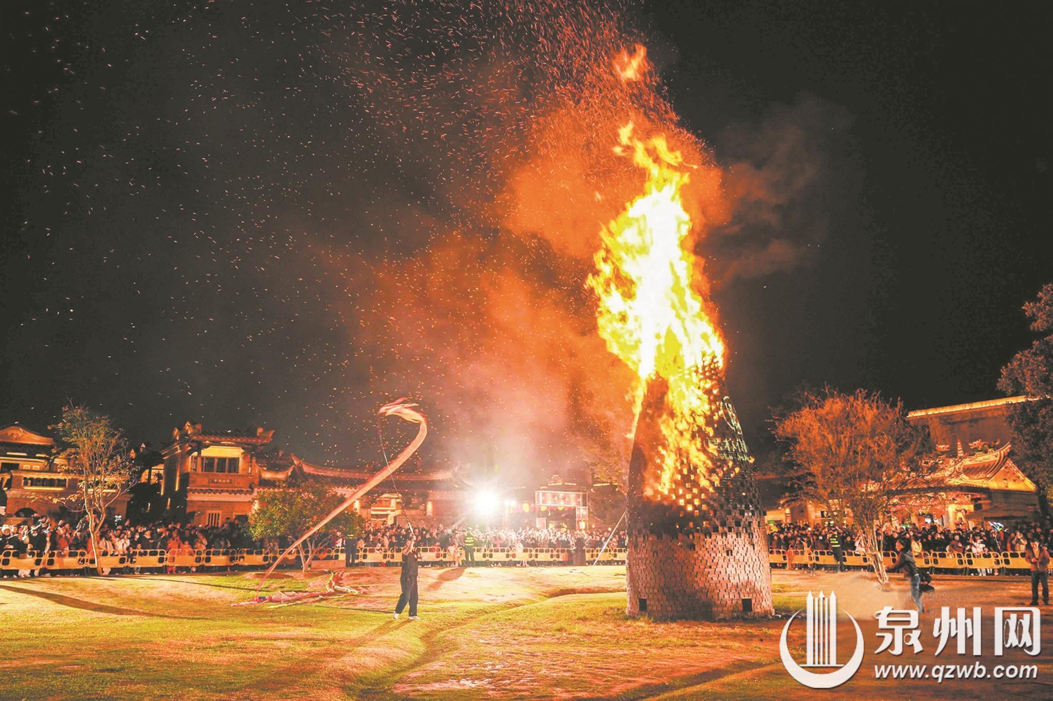 泉州网3月5日讯 (融媒体记者张晓明 丁荣汉)红砖古厝间,醒狮腾跃;百年侨村里,游人如织。昨晚,晋江梧林传统村落再现闽南传统民俗——烧塔仔。市民、游客围成一圈,望着绚烂的篝火从砖塔中蹿出,祈福祝愿,欢度美好夜晚。