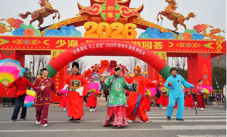 上午9时30分,“岁焕新风马上启程”2026年胶州市新春秧歌会集中展演正式开始,胶州秧歌在这座城市欢腾起舞。作为“胶州秧歌之乡”的胶州市胶东街道,此次特意组织了2支传统胶州秧歌队伍亮相,73岁的国家级非遗传承人吴英民带着女儿与弟子们率先登场,男刚女柔“三弯九动十八态”的经典扭姿、鼓子滑稽幽默的神态,瞬间点燃现场气氛。